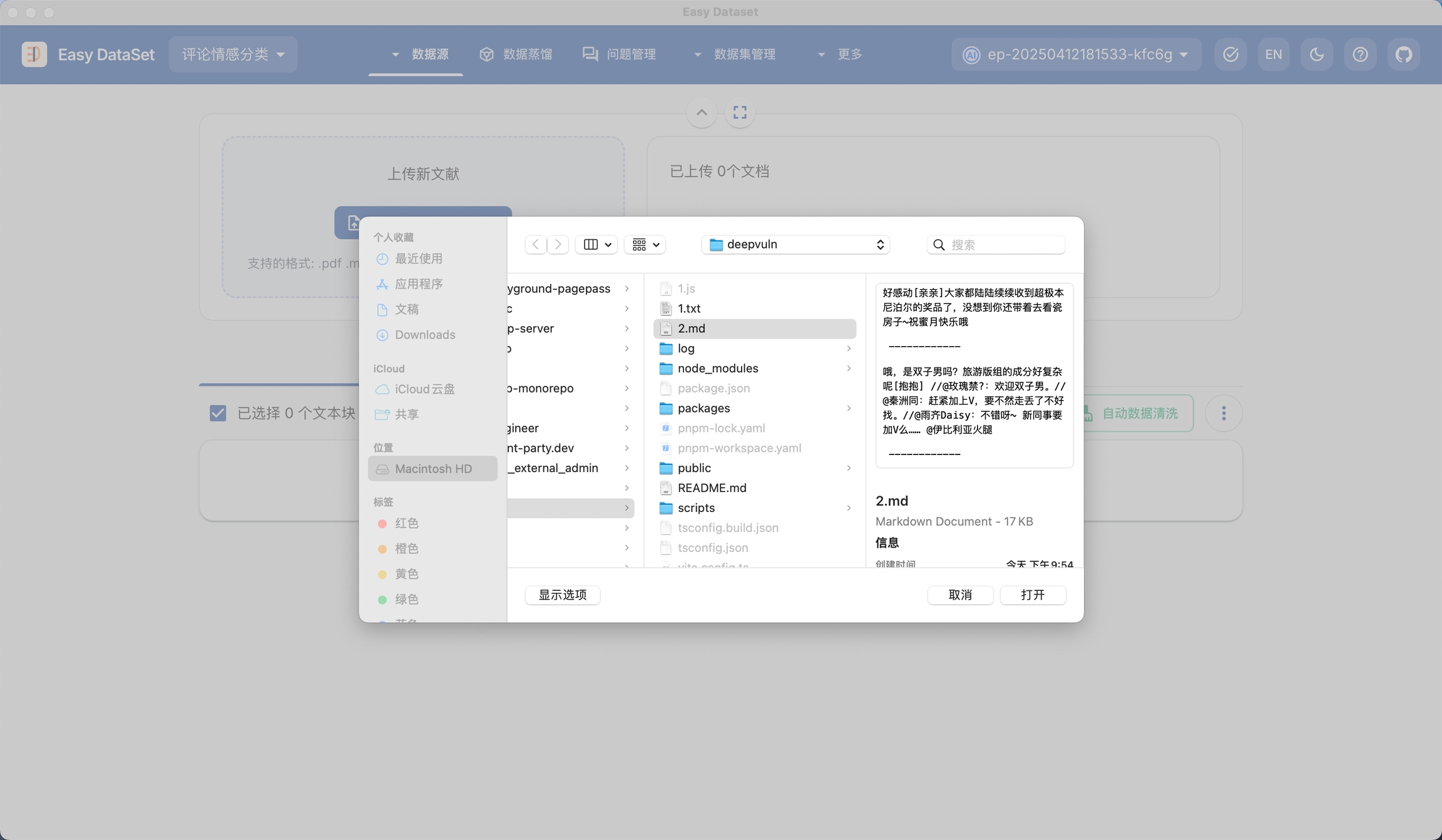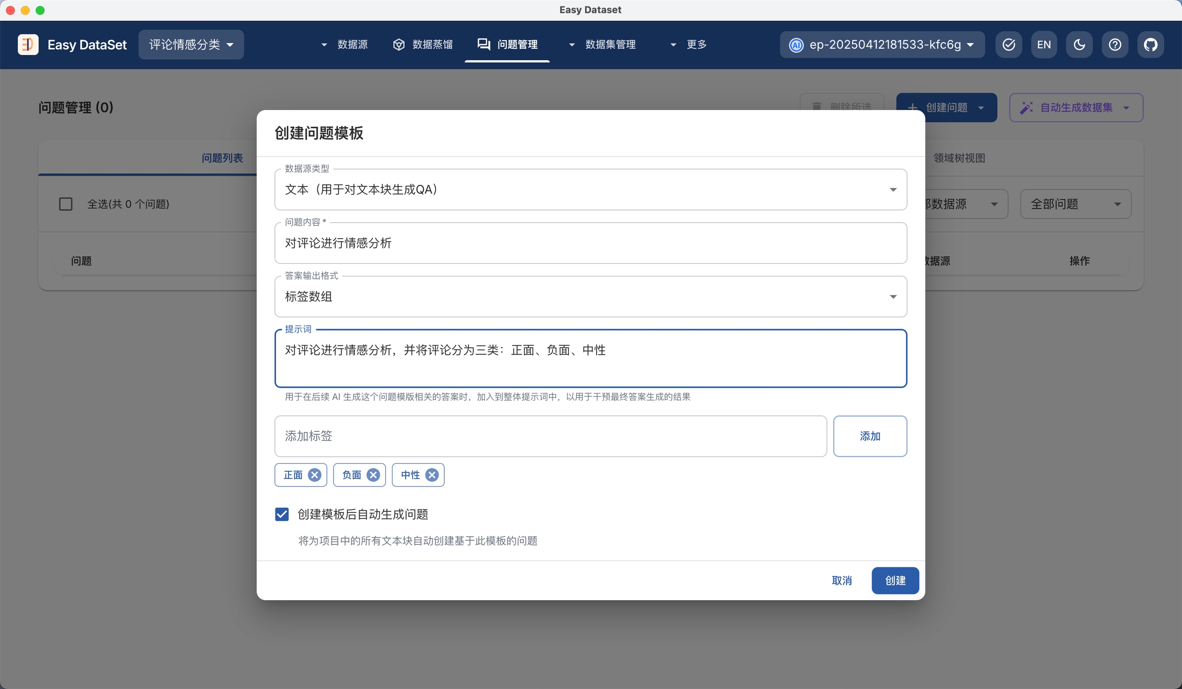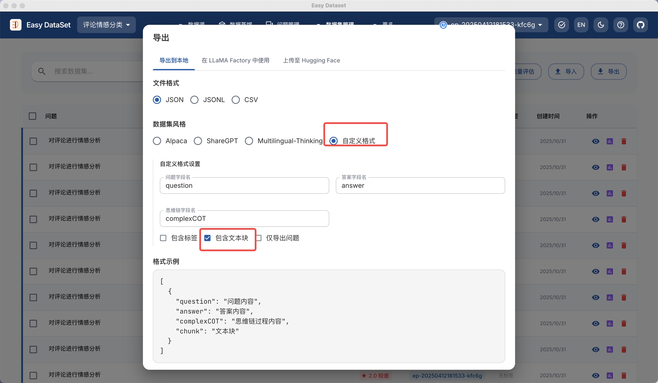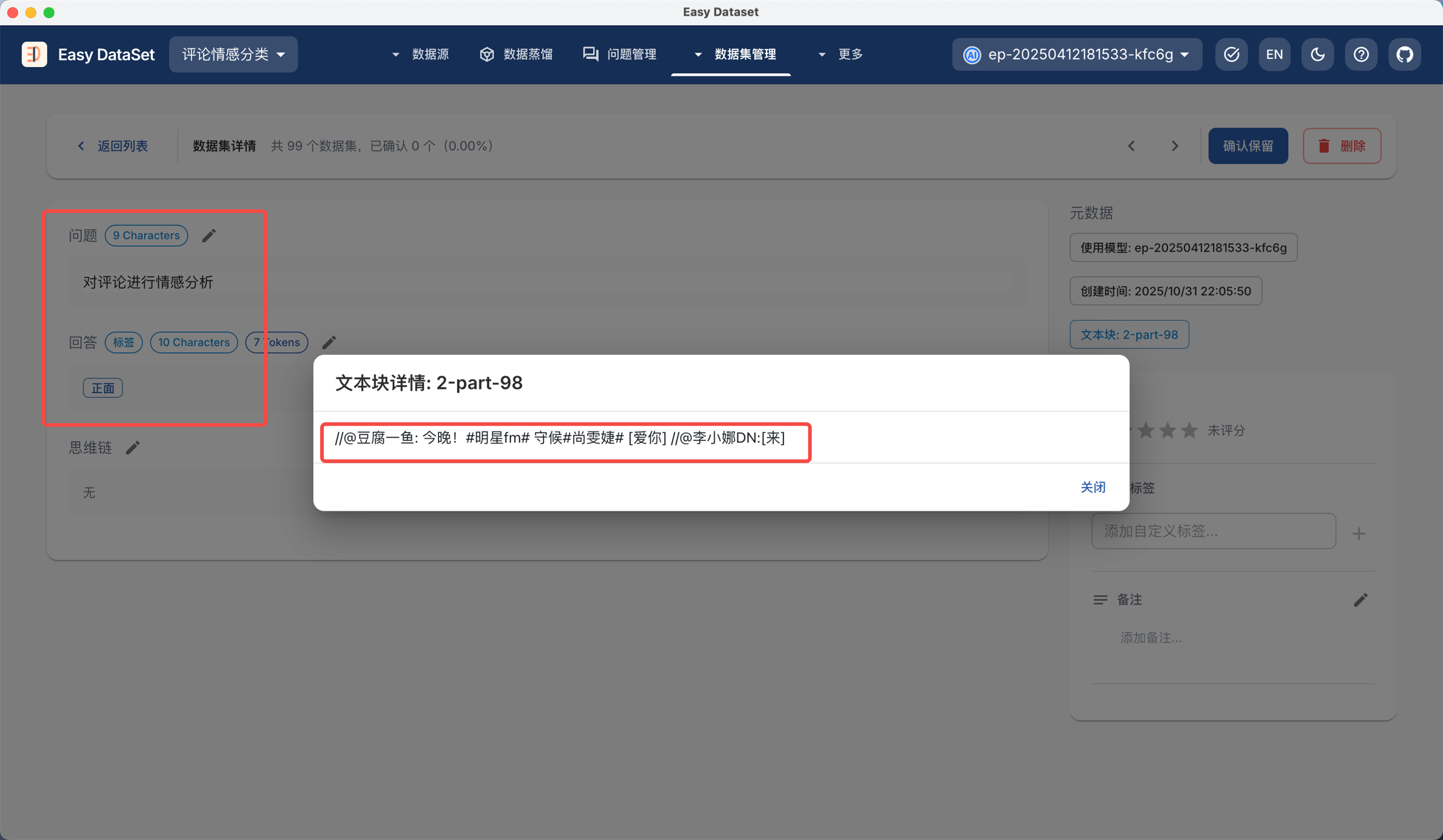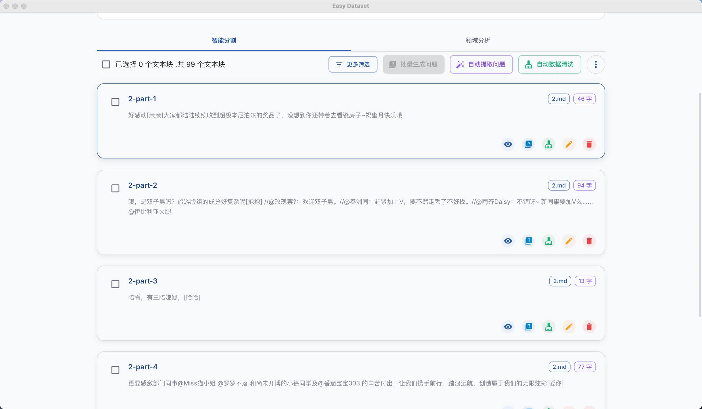 然后我们看到 EDS 为每个文本块都创建了这个问题,我们点击自动提取数据集 - 单轮对话数据集: