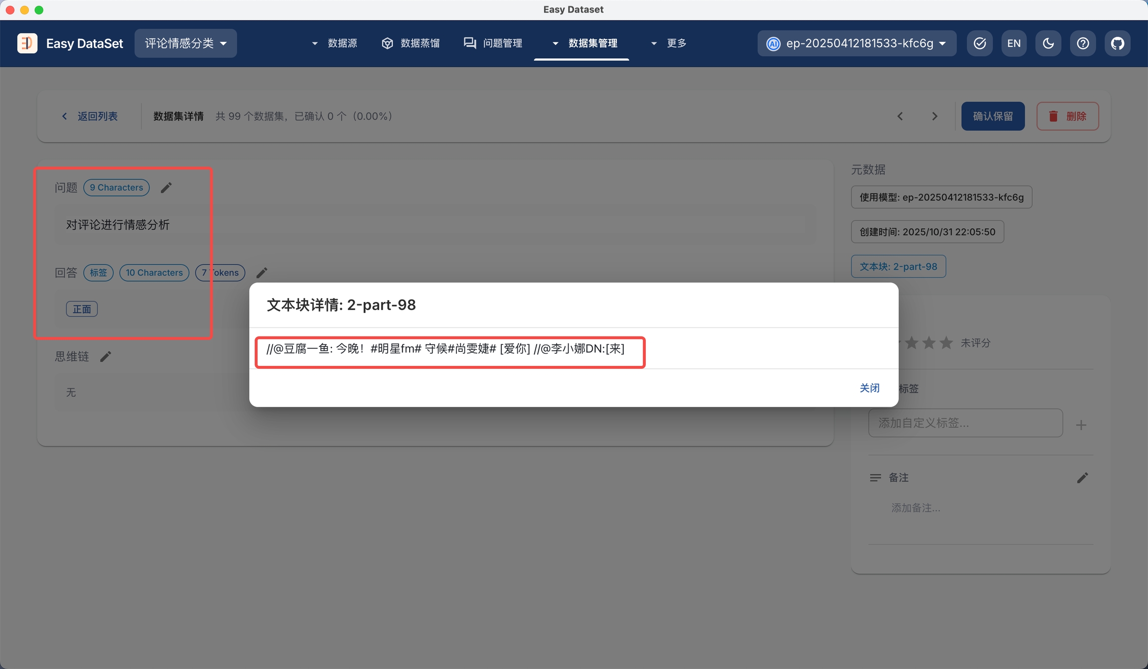 然后我们在数据集详情可以看到对文本块(评论)的分析结果,答案只分布在了正面、负面、中性这三个标签内: