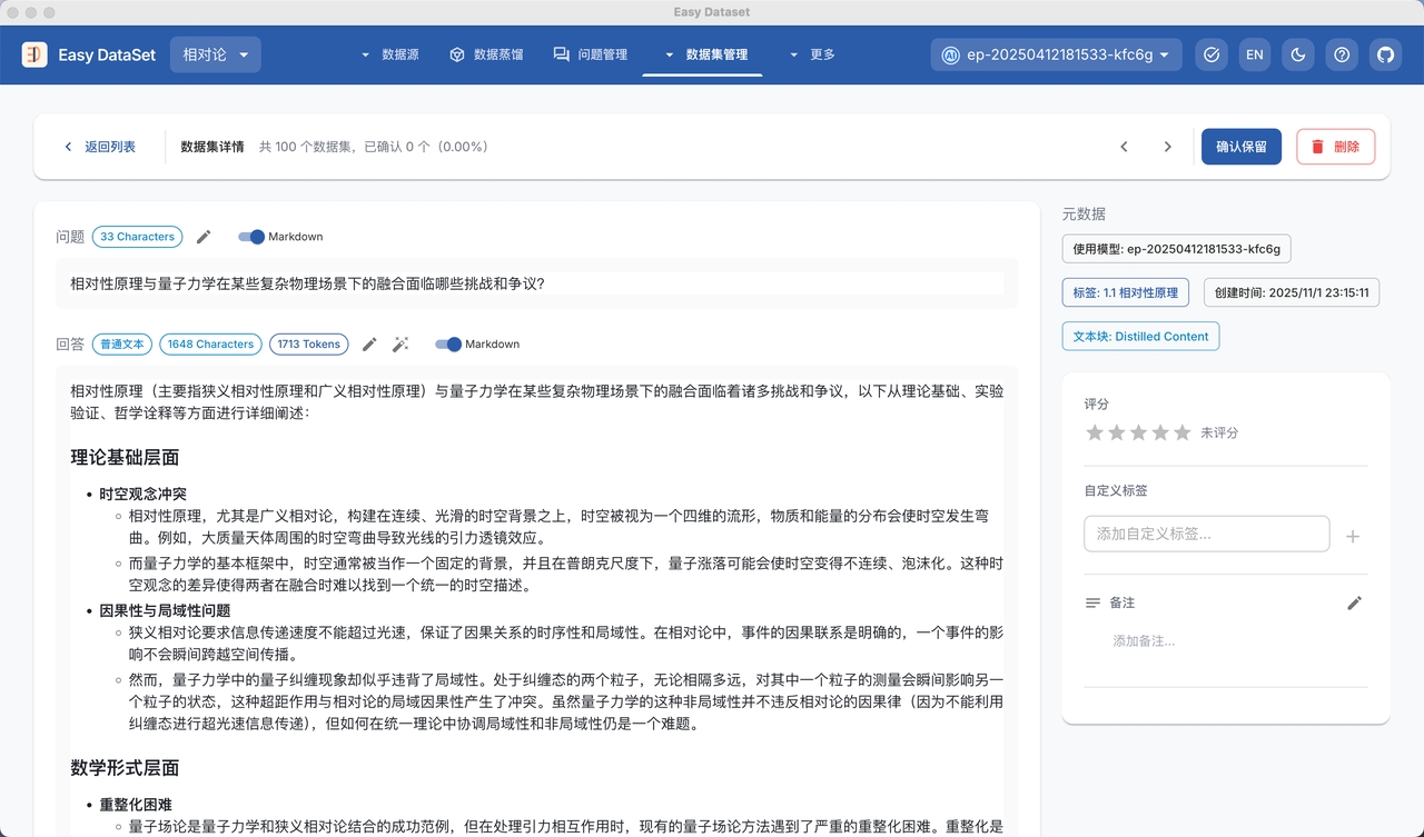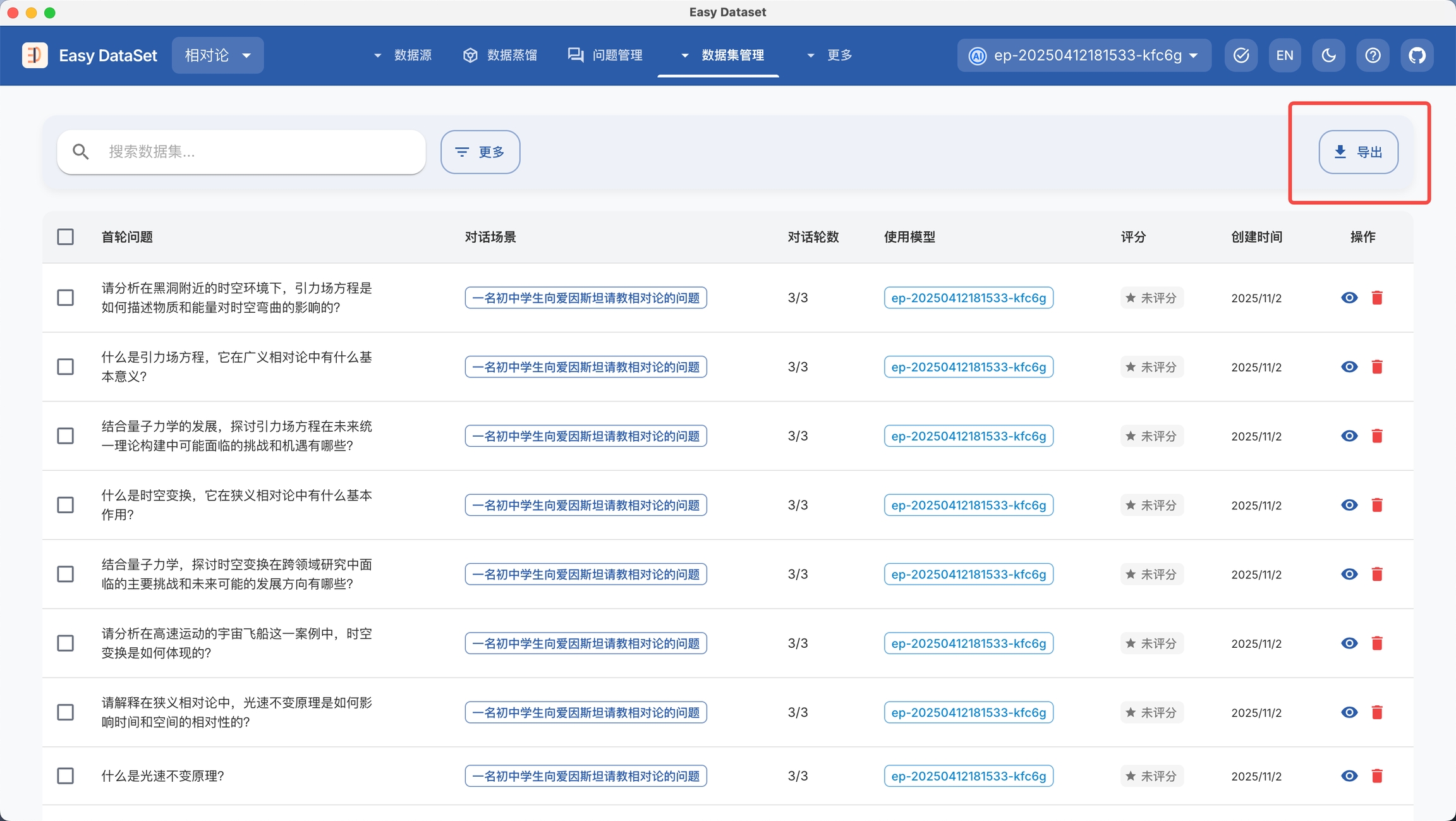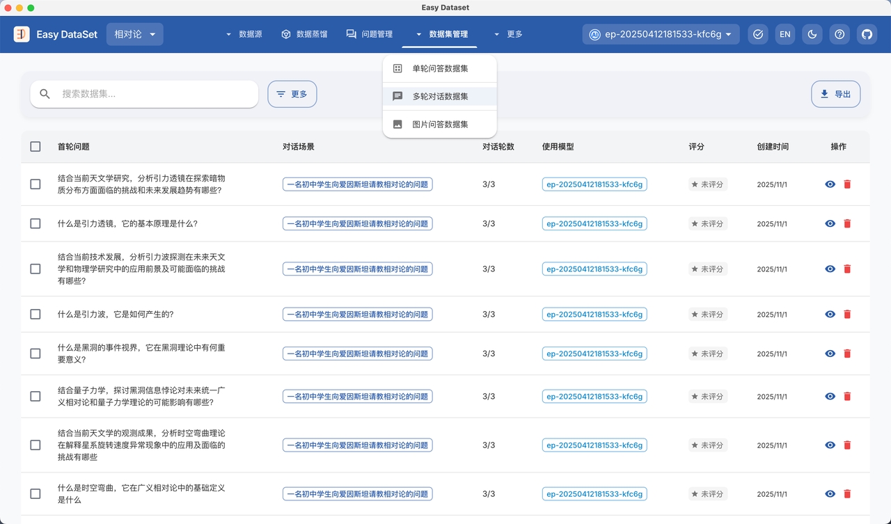 这样,我们不用等待整个蒸馏任务完成,就可以去 Review 已经生成好的数据集。下面,我们来到多轮对话数据集模块: