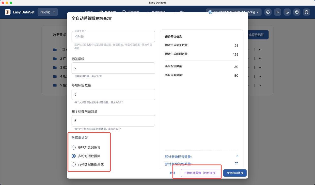 数据集可以选择生成单轮、多轮对话数据集或者两个都生成,注意这两种数据集的构建流程是完全不一样的,大家感兴趣可以到提示词模块去看一下,为了方便对比,我们选择两种数据集都生成。另外呢,在最新版本中,我们也支持了后台异步运行蒸馏任务。
