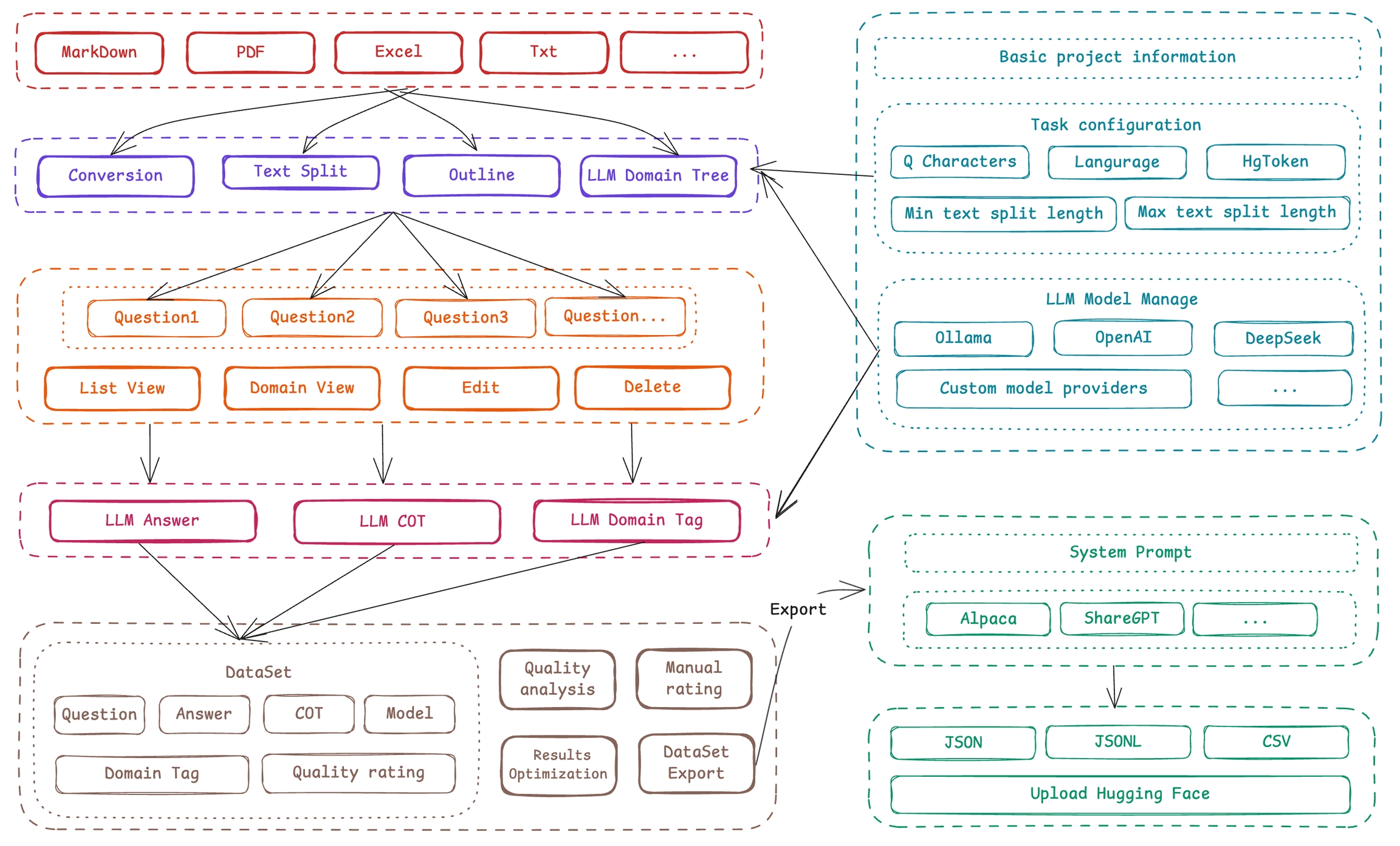 Multi-format Export: Supports Alpaca, ShareGPT standard formats, custom field mapping, including domain tags and COT information.
