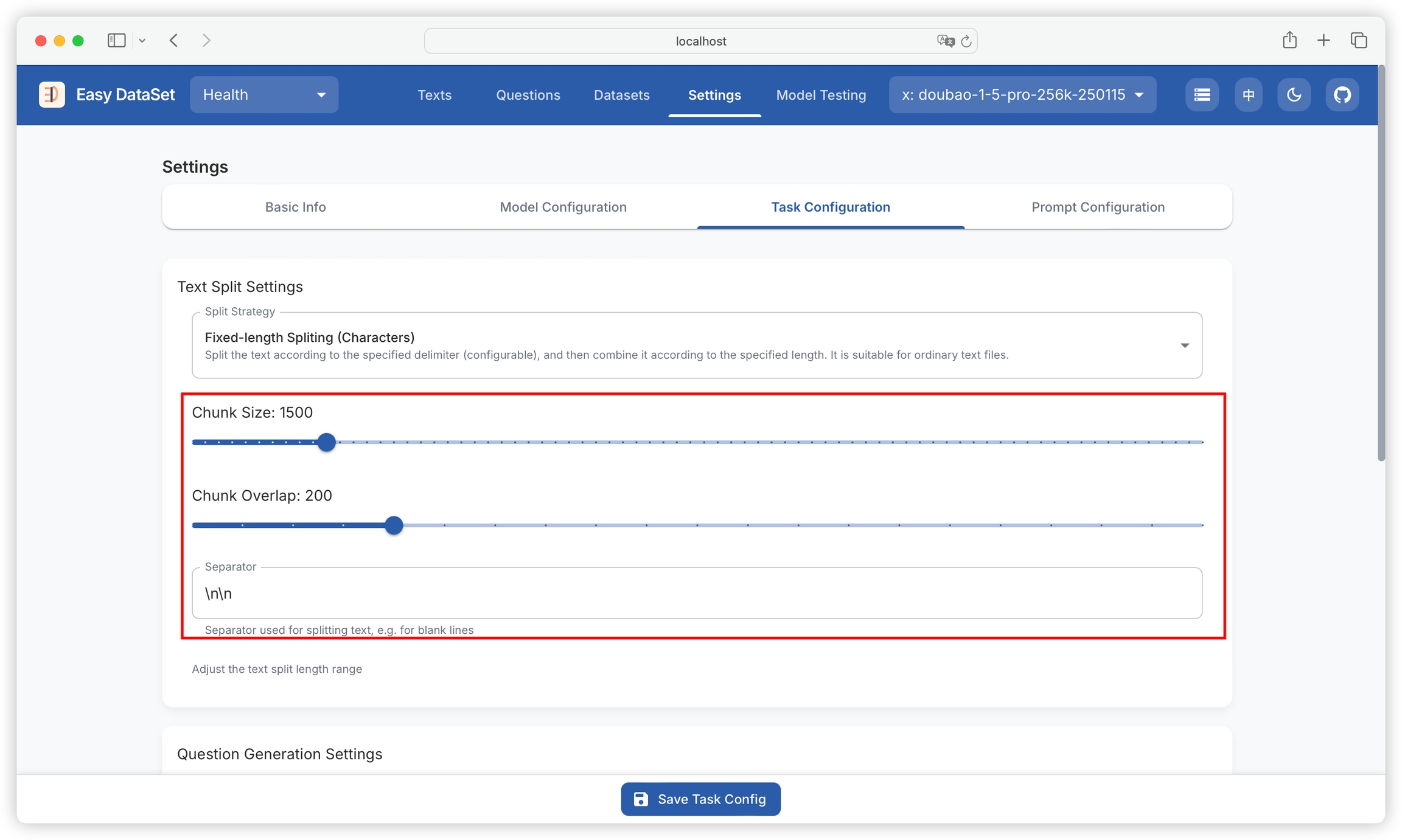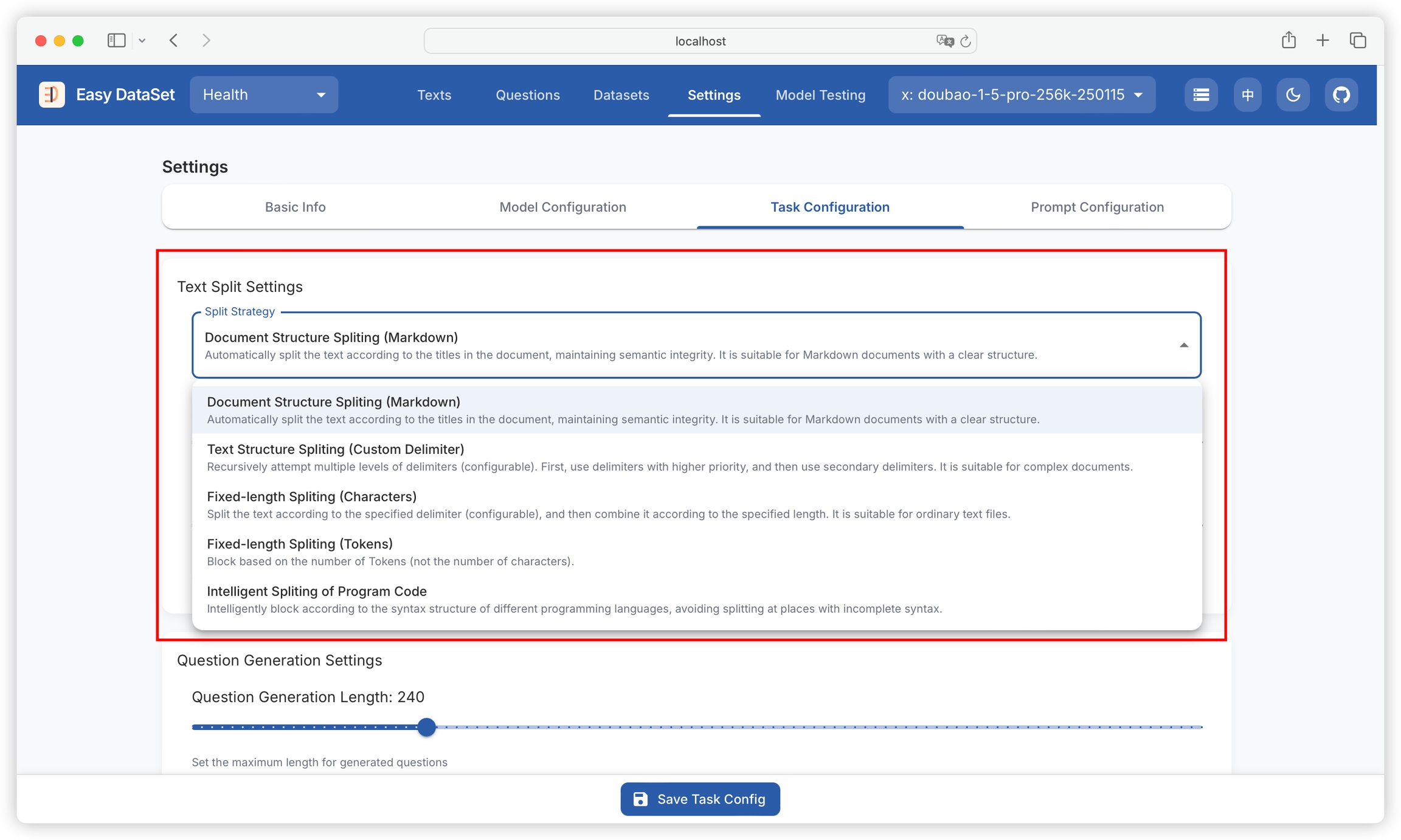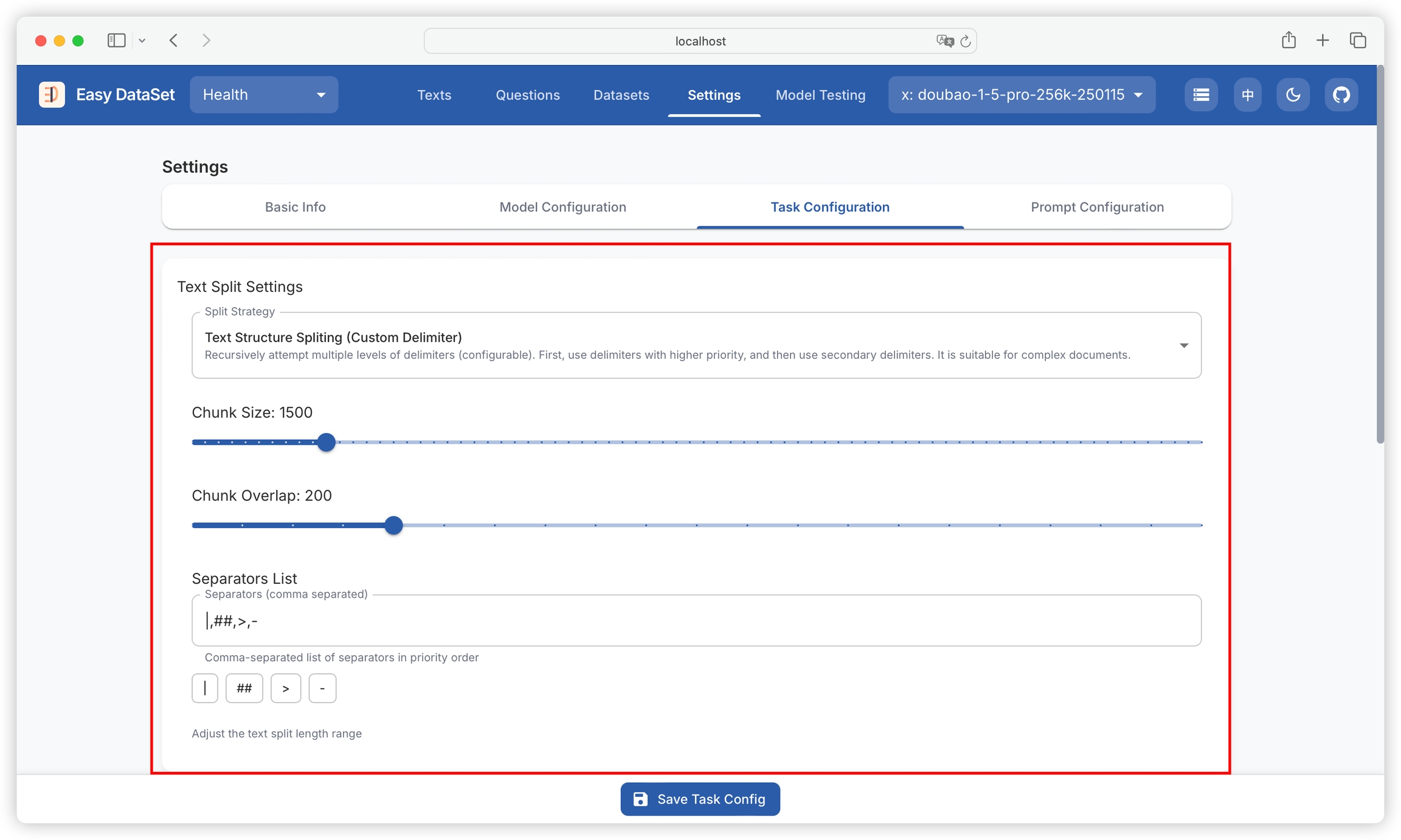 In Easy Dataset, you can customize different chunking strategies for literature processing through "Settings - Task Settings - Chunking Settings".