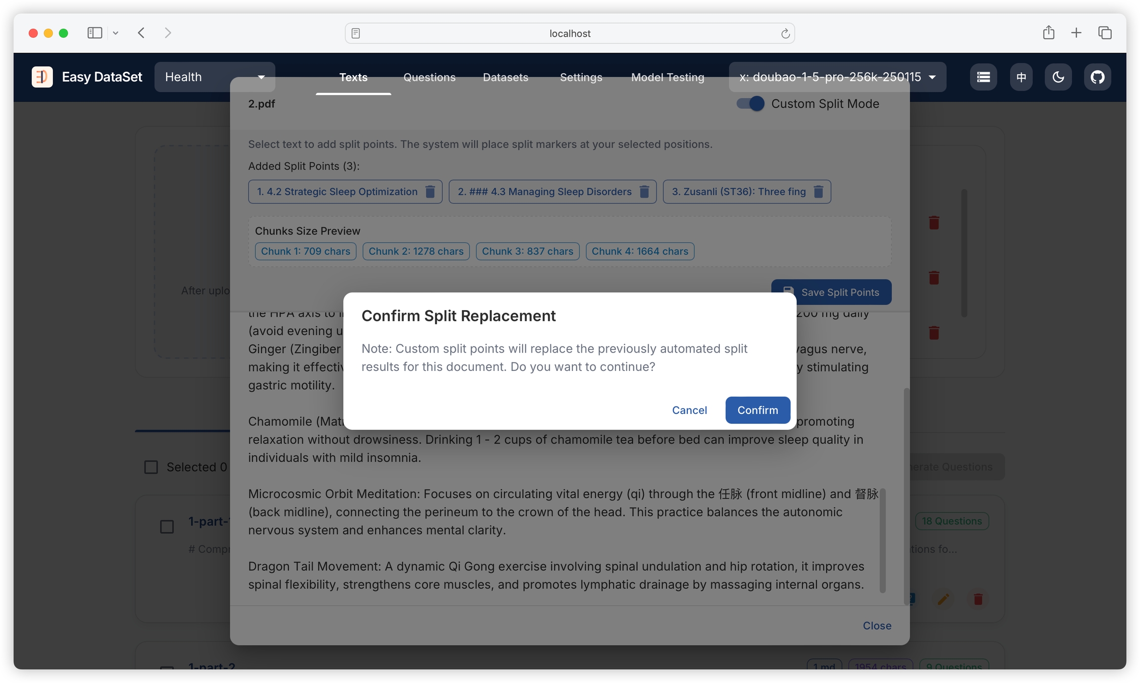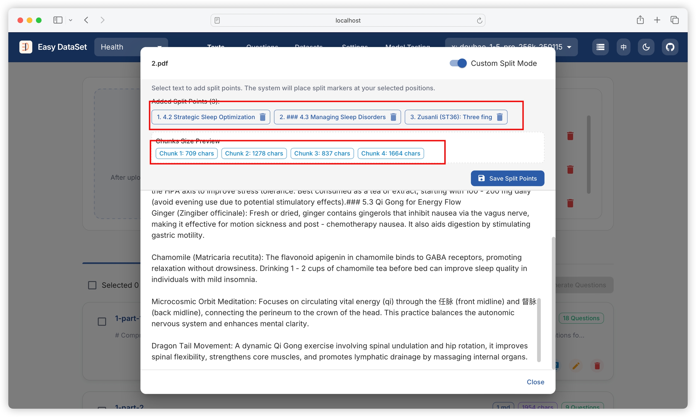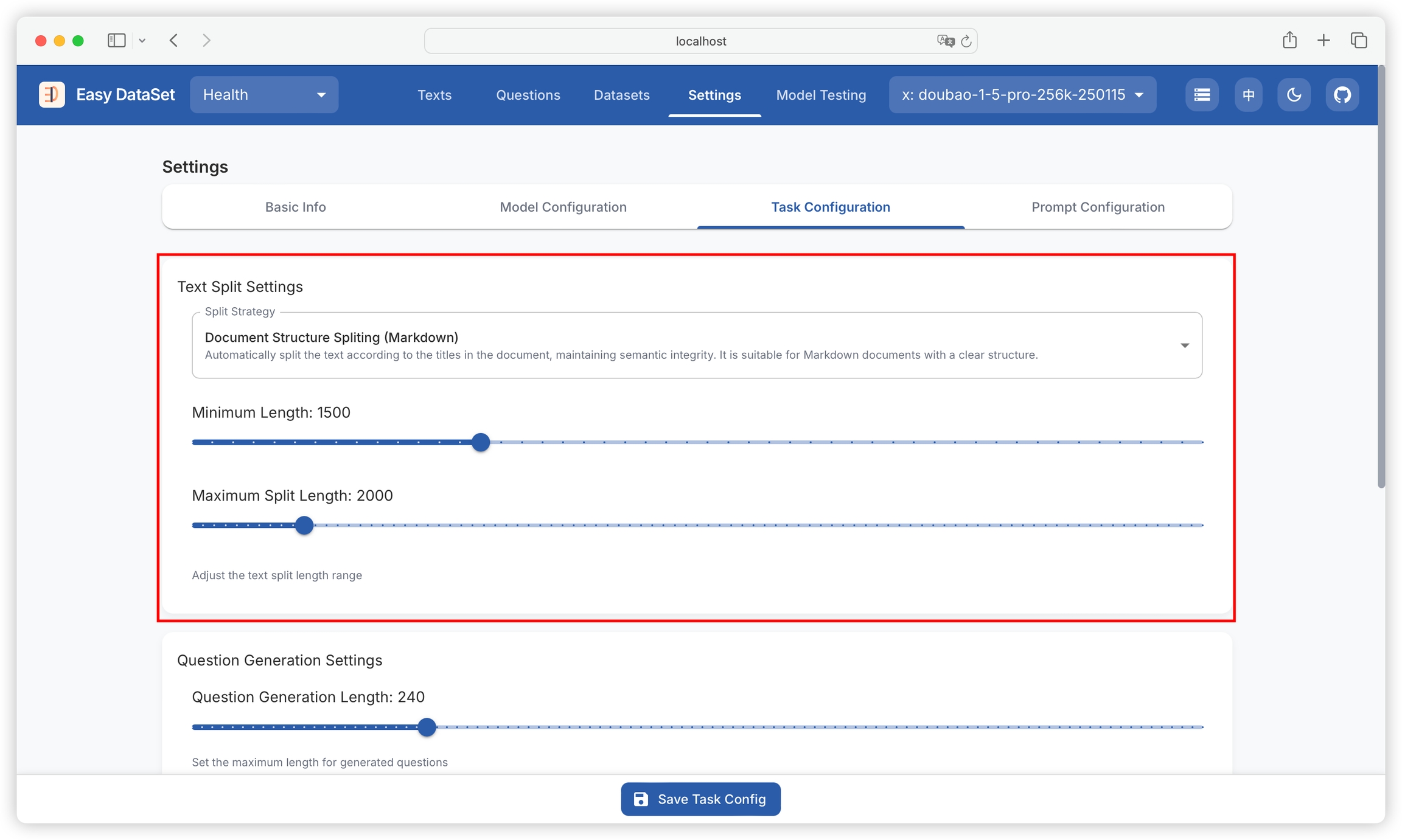 In Easy Dataset, you can customize different chunking strategies for literature processing through "Settings - Task Settings - Chunking Settings".