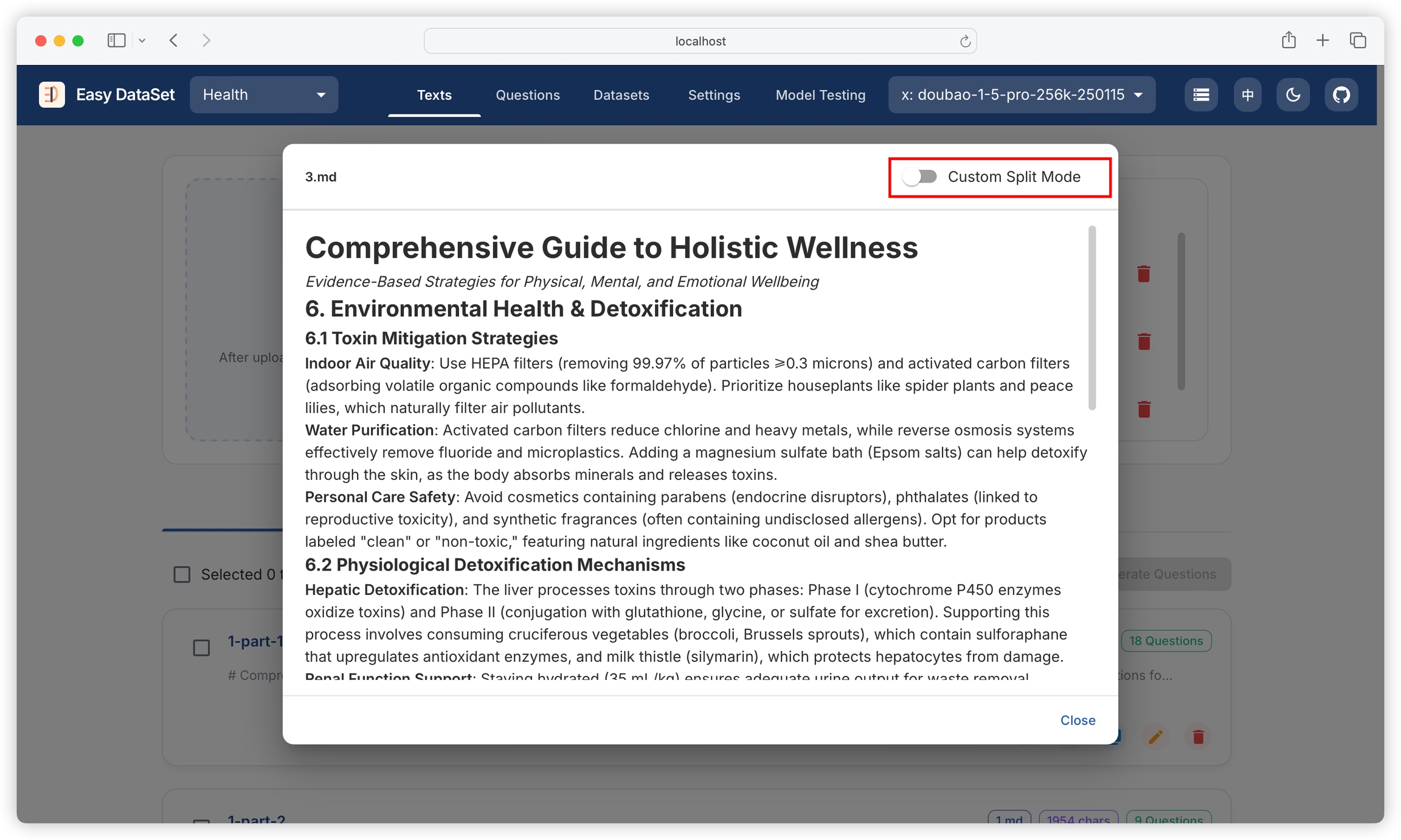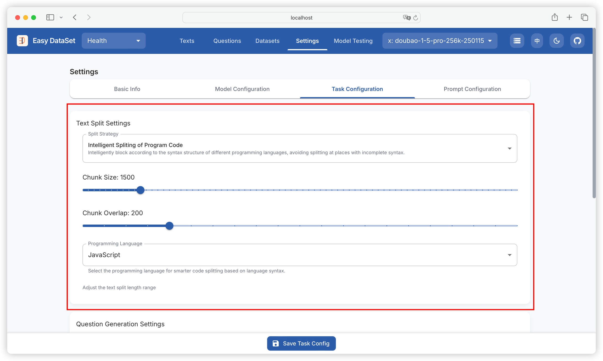 When the target text contains a large amount of code, traditional splitting methods are not applicable, and may cause code fragmentation. Easy Dataset also provides a splitting method based on intelligent code semantic understanding, which can choose the target language for chunking: