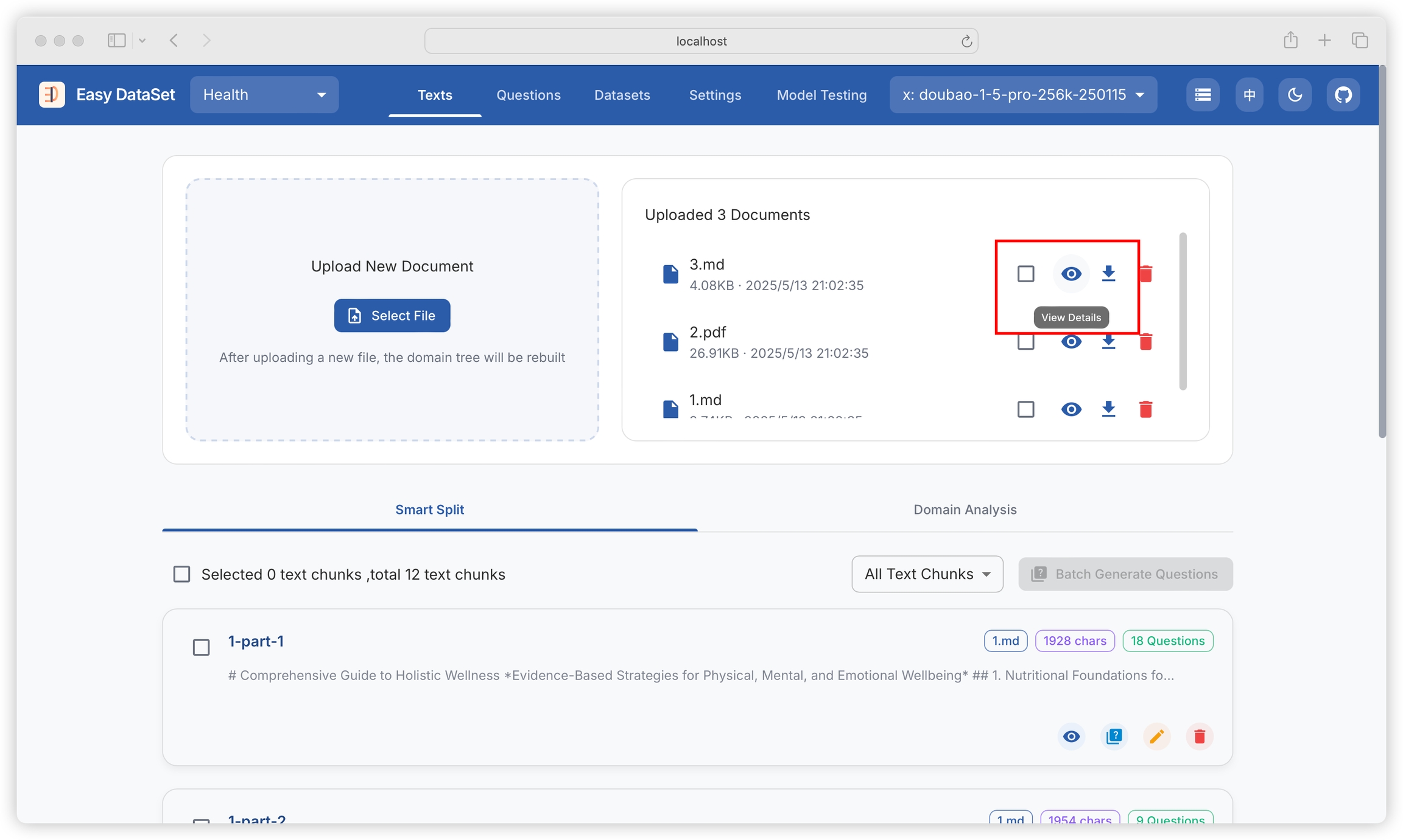 When the above chunking strategies cannot meet your needs, you can choose to use the visual custom chunking function. First, find the literature to be chunked and click to view details: