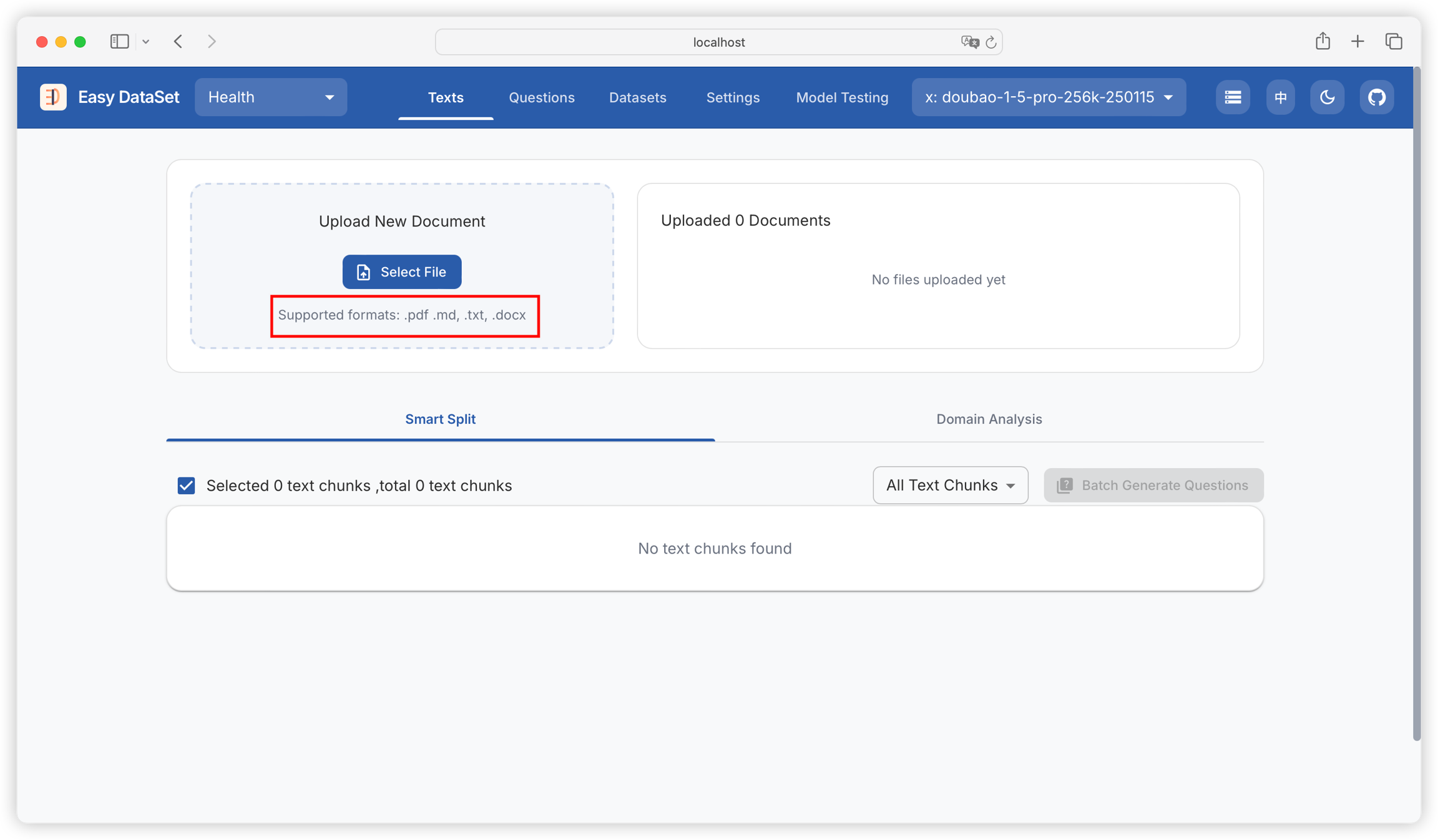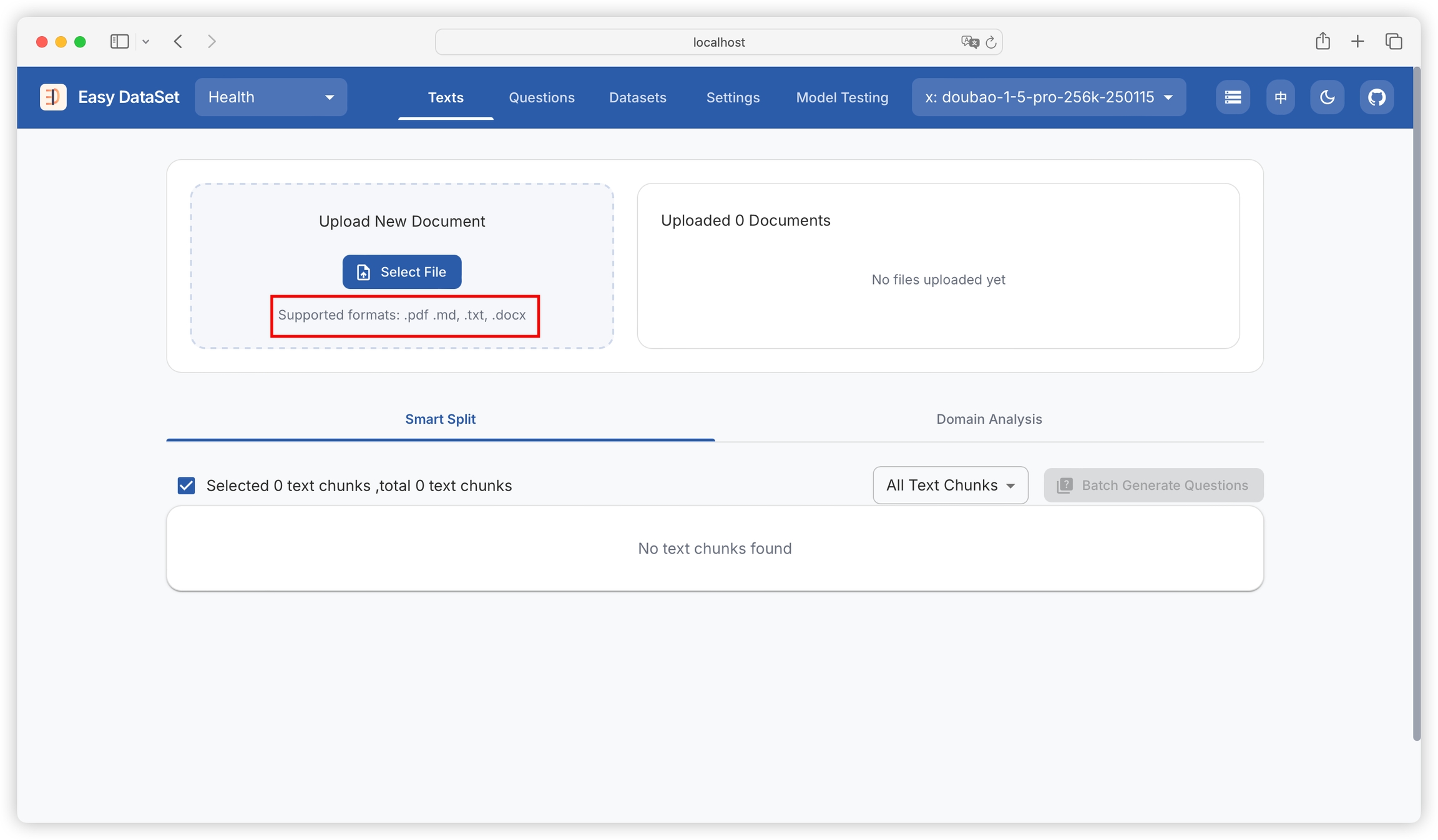 Currently, the platform supports processing literature in four formats: Markdown, PDF, DOCX, and TXT: