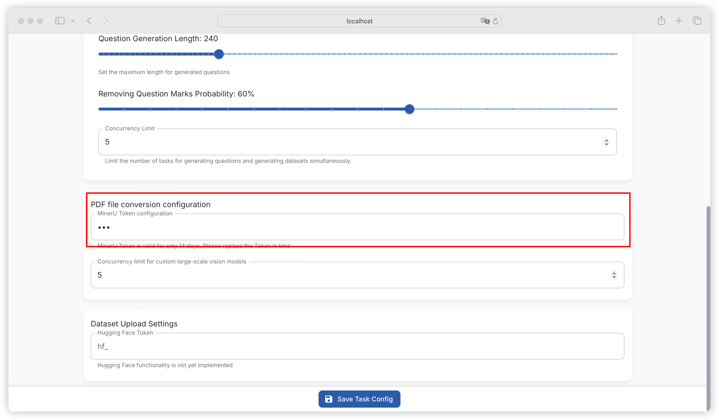 You can configure the MinerU API Key through "Settings - Task Settings" to call the MinerU API for parsing. It can deeply parse complex PDF files containing formulas and charts, suitable for academic papers, technical reports, and other scenarios. The more complex the file, the slower the processing speed. You can apply for a MinerU API Key through https://mineru.net/apiManage/token (note that the validity period is 14 days, after which you need to reconfigure).