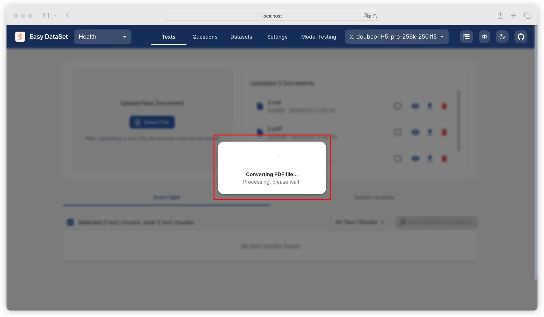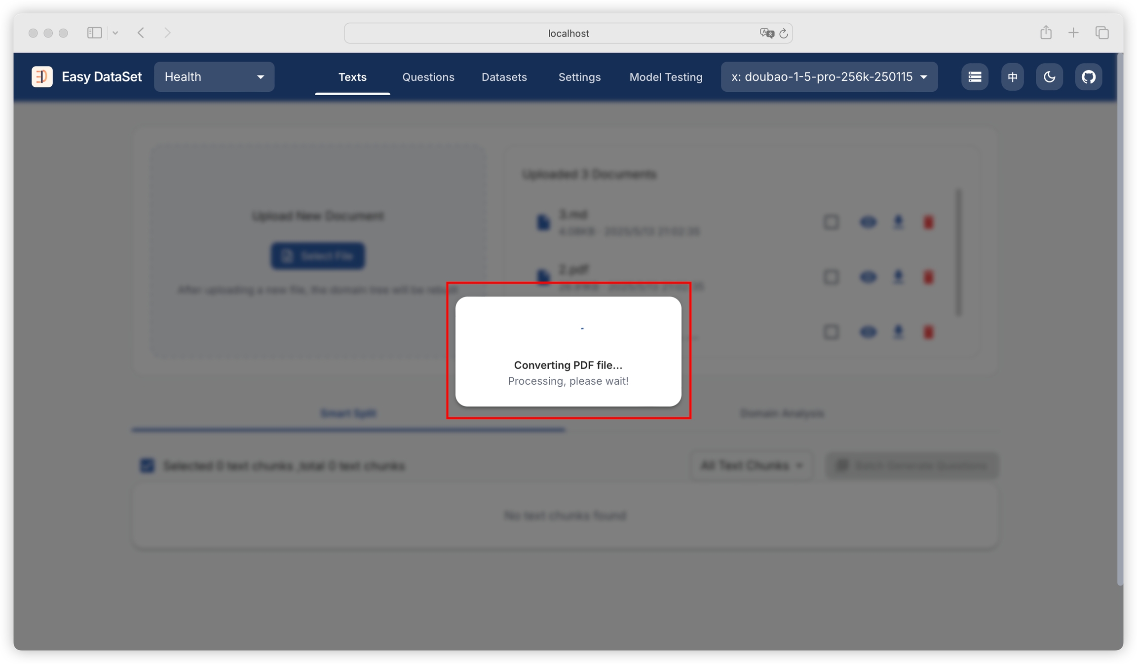 When choosing MinerU API parsing or custom vision model parsing, the PDF processing time may be longer, please wait patiently: