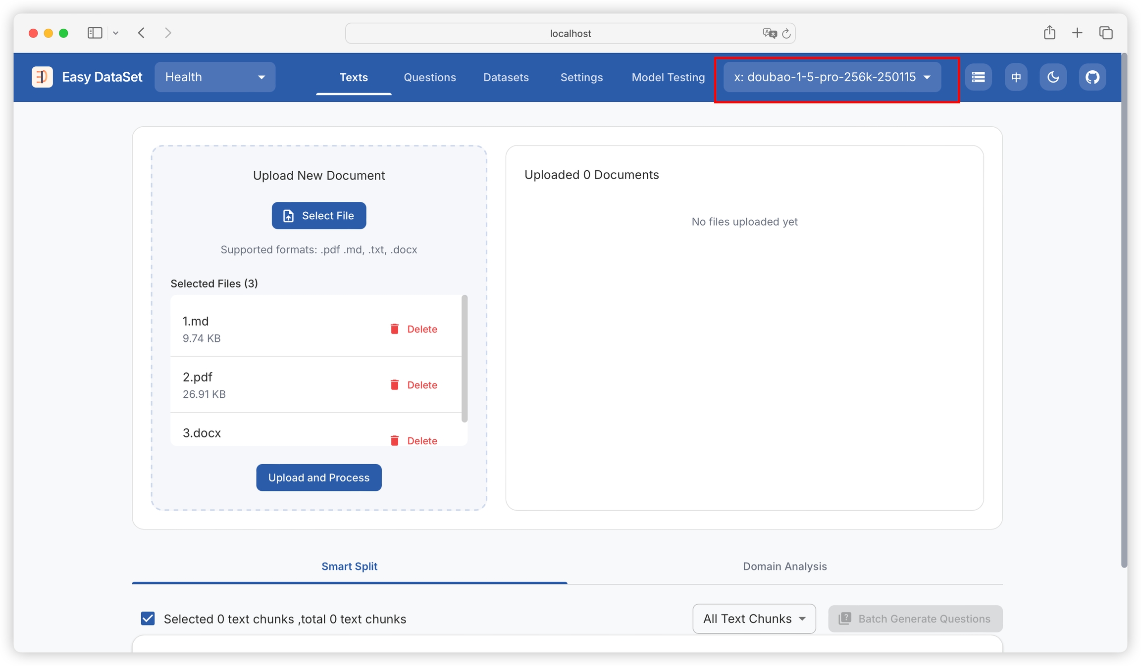 Before uploading, please select the model in the top right corner, otherwise, the processing will fail: