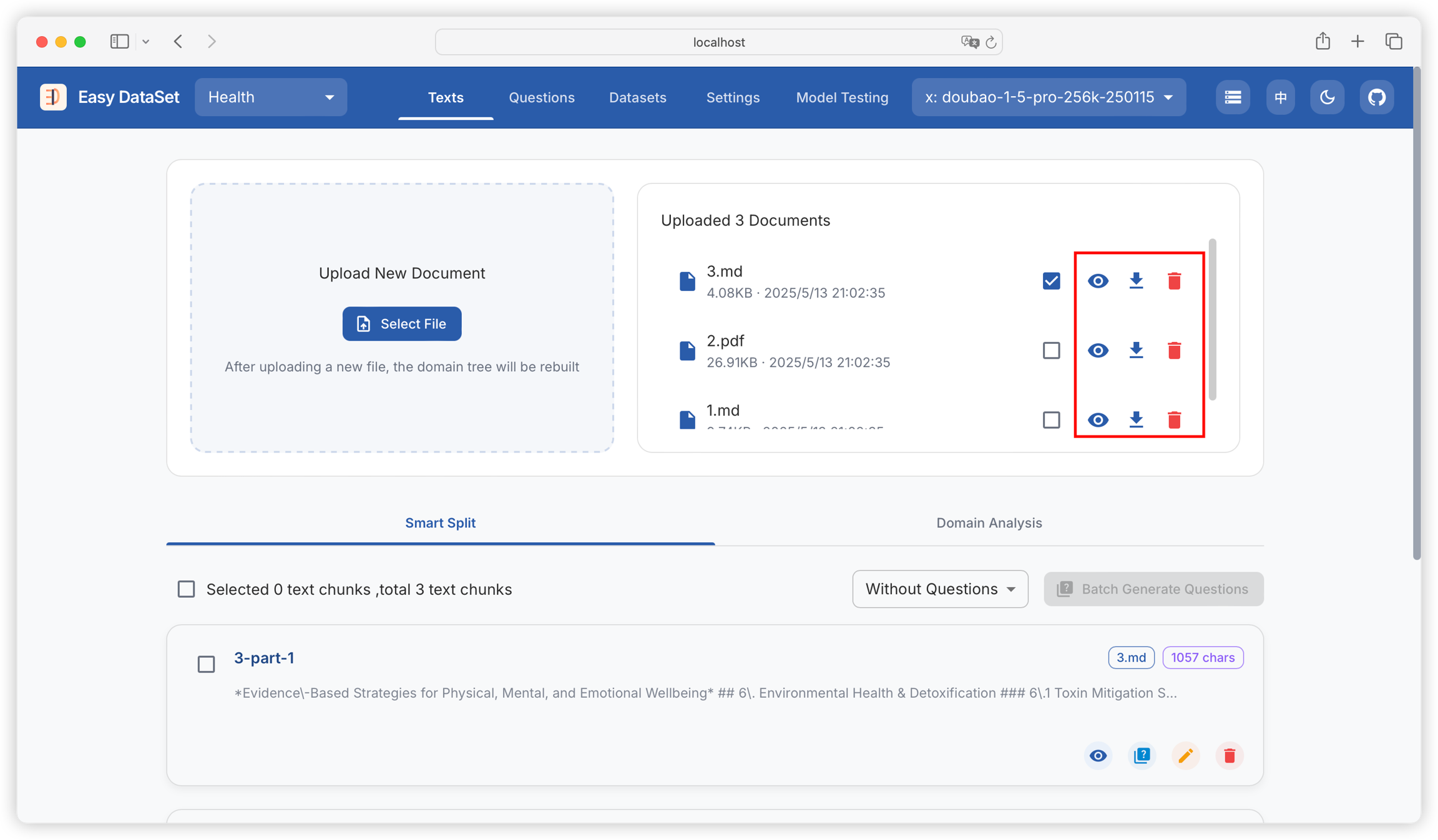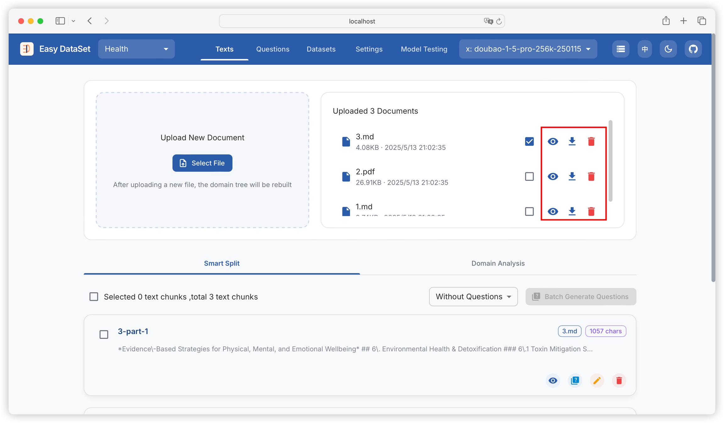 We can preview the literature details (converted to Markdown), download the literature (Markdown), and delete the literature: