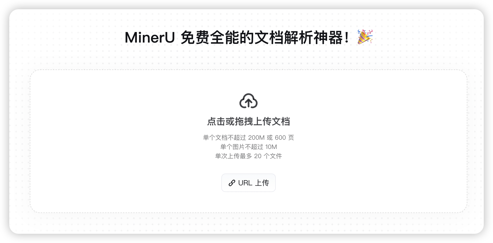 Redirects to the MinerU platform: https://mineru.net/OpenSourceTools/Extractor, where users can parse PDFs and download Markdown files, then return to the platform to re-upload them.