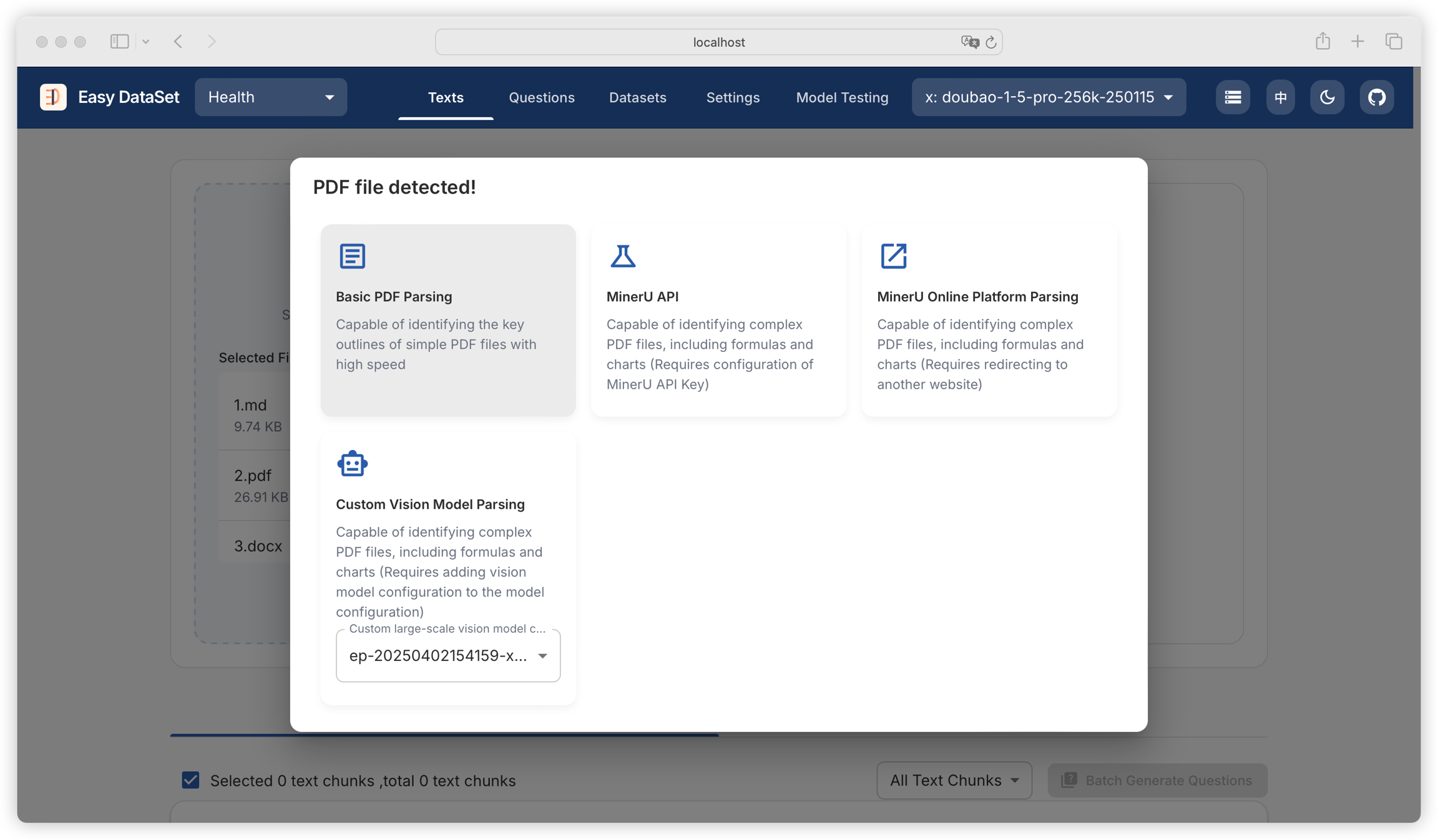 Due to the special nature of PDF format, the platform supports four different PDF processing methods for different scenarios. When literature containing PDF format is uploaded, a dialog box will appear: