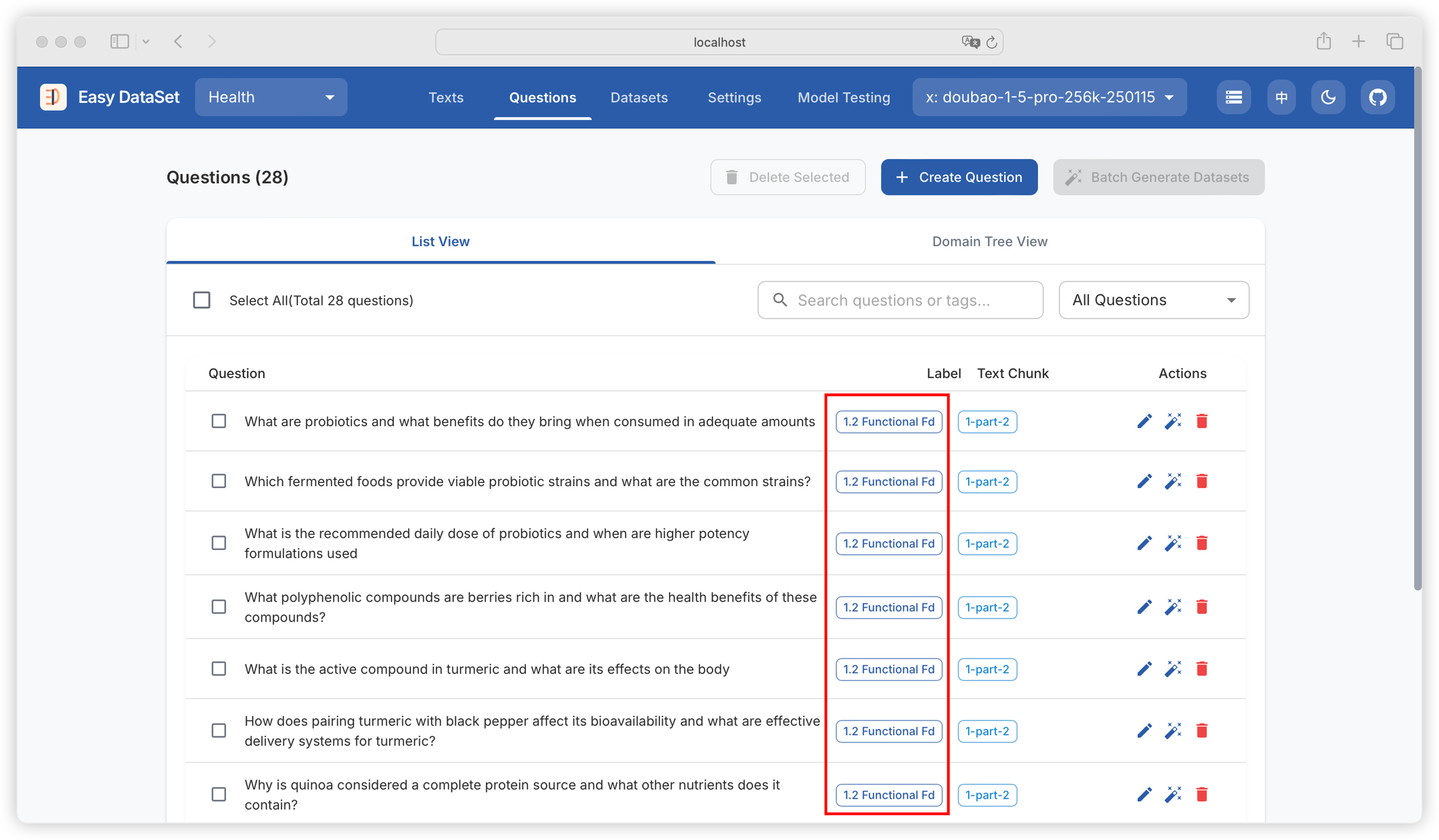 In subsequent tasks of generating questions and datasets, the platform will build based on this domain tree, and map the generated questions and datasets to each domain tag. The domain tree allows each dataset to have global understanding capabilities and reduces the possibility of generating duplicate datasets.
