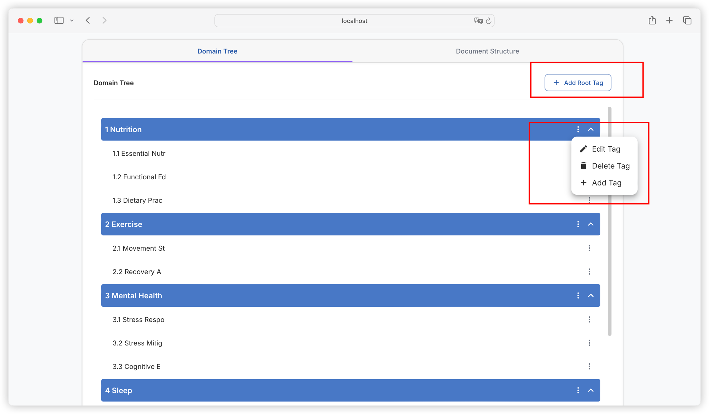If you feel that there are inaccuracies or imperfections in the AI-generated domain tree, you can also directly manually add, modify, or delete tags. It is recommended to confirm the domain tree division more accurately before generating questions.