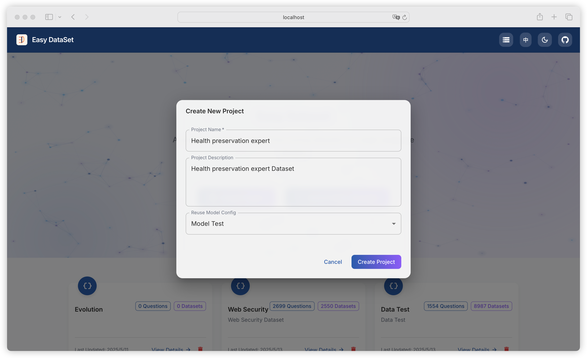 To create a new project, you only need to input the project name and description, and you can reuse model configurations from other projects.