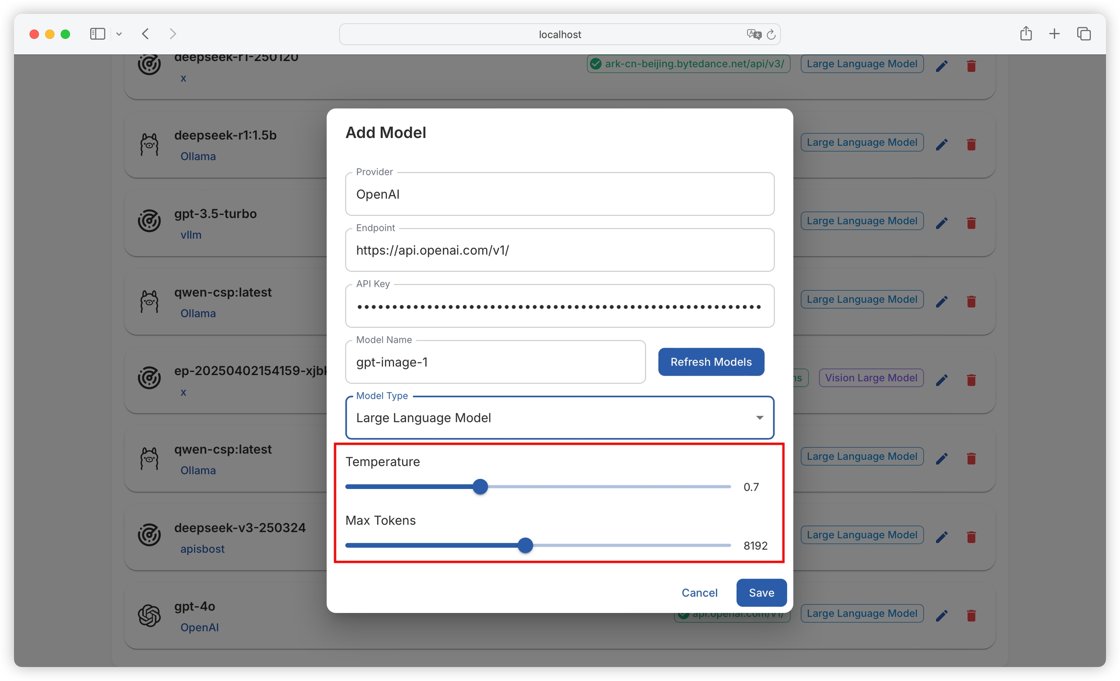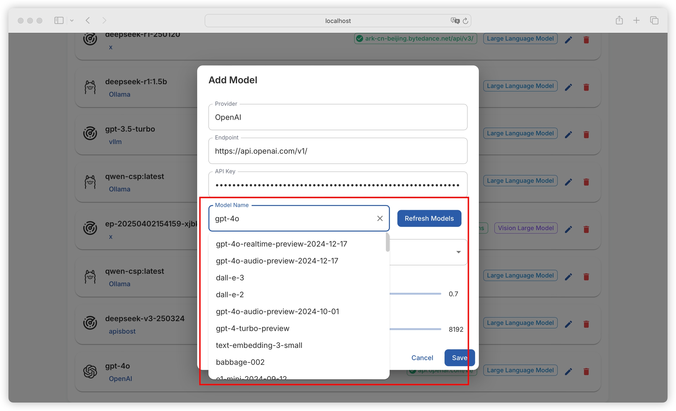 Note: Model providers not in the above list are also supported for configuration. Information such as model provider, API interface address, API Key, and model name all support custom input. As long as the API conforms to the OPEN AI format, the platform can be compatible with it.