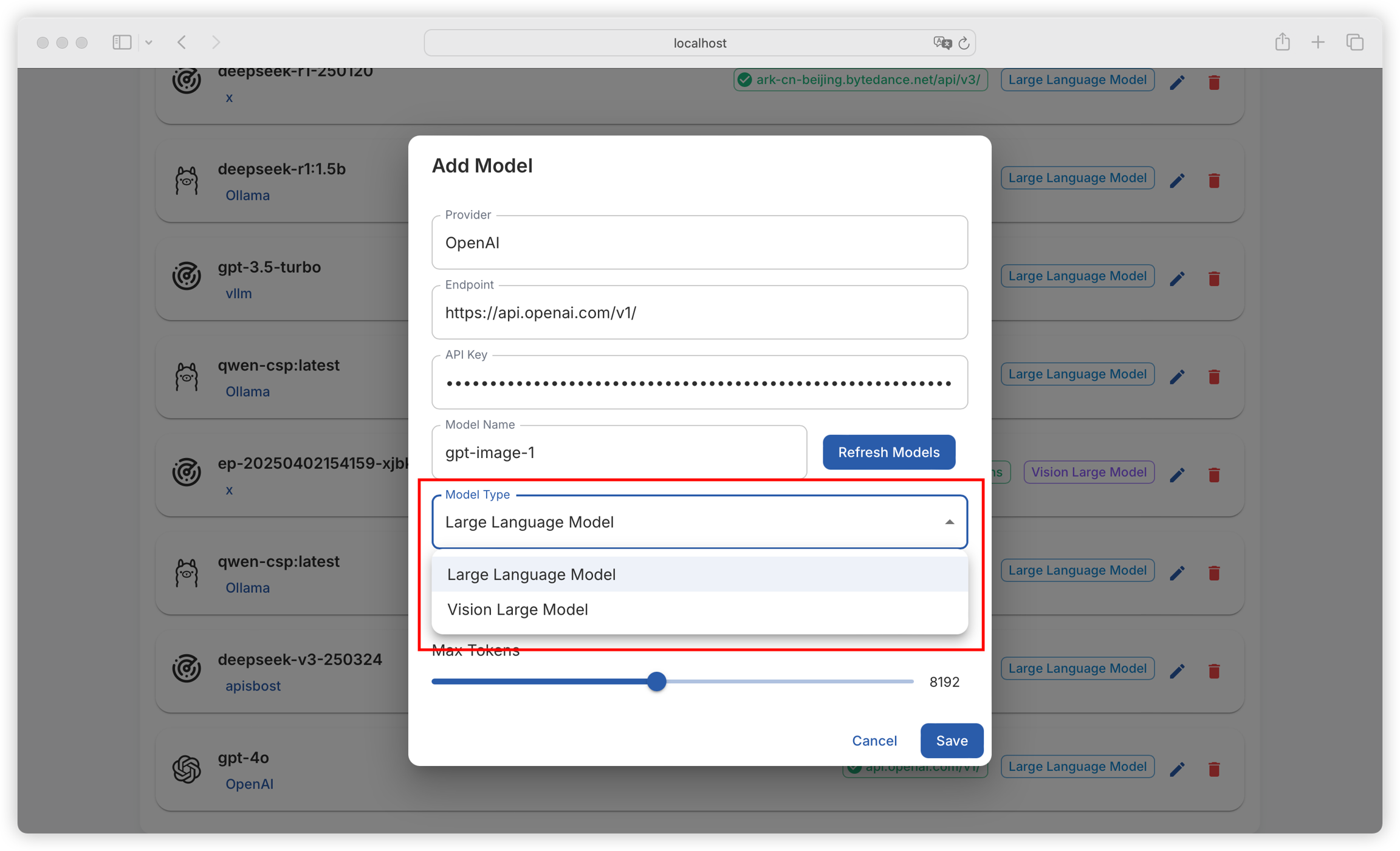 Click Refresh Model List to view all models provided by the provider (you can also manually enter the model name here):