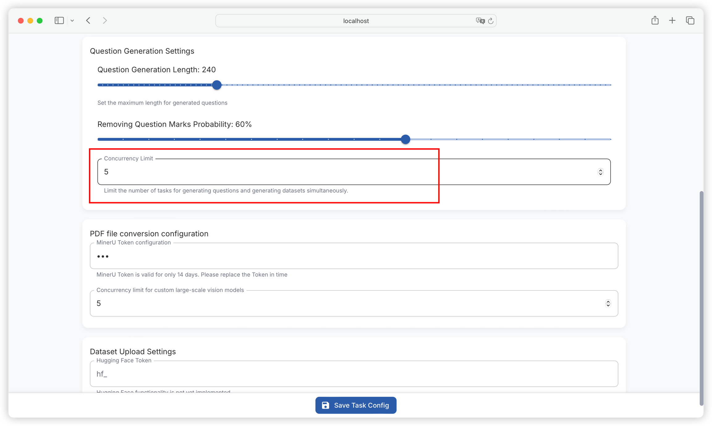 The number of concurrent tasks in Task Settings - Question Generation Settings can still control the maximum number of concurrent tasks for batch dataset generation:
