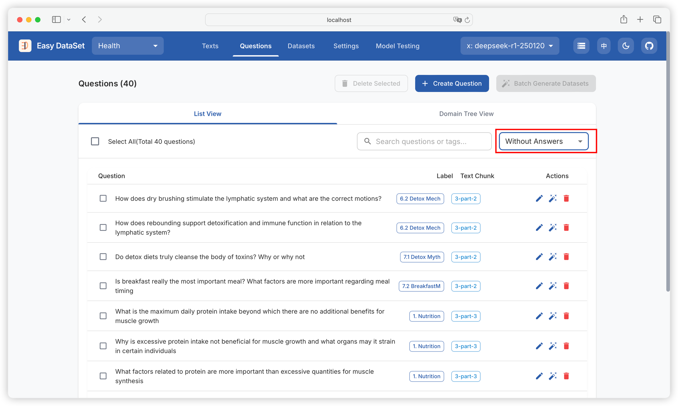 Easy DataSet generates answers based on the question + the text block corresponding to the question + domain tags together, to ensure the relevance of the answer to the literature itself.