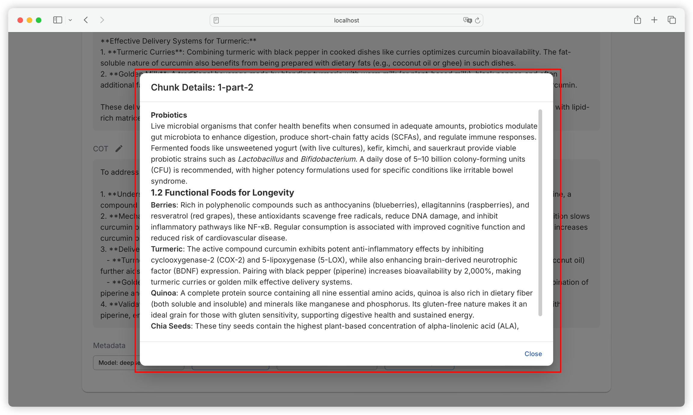 Click on a single dataset to view its details, including question, answer, chain of thought, model used, domain tags, creation time, and text block: