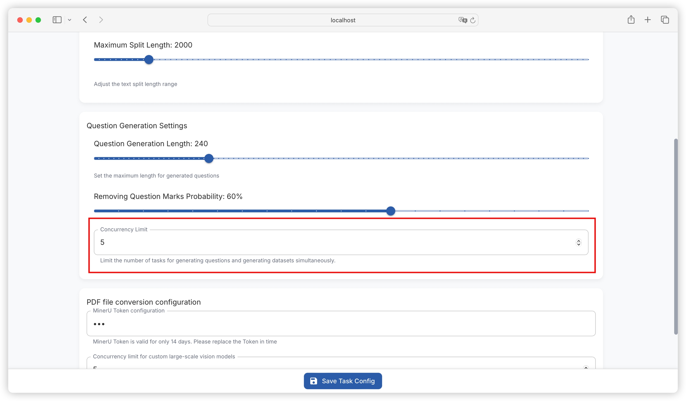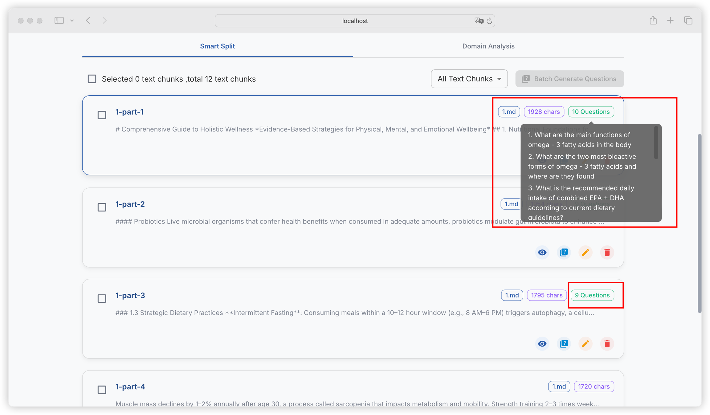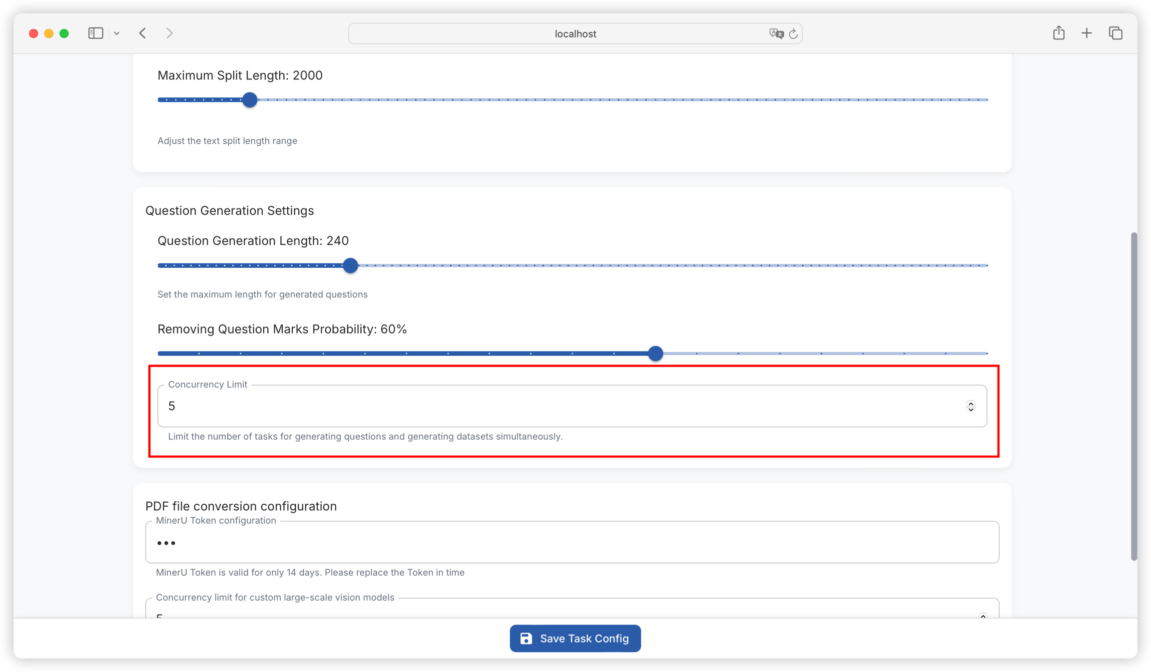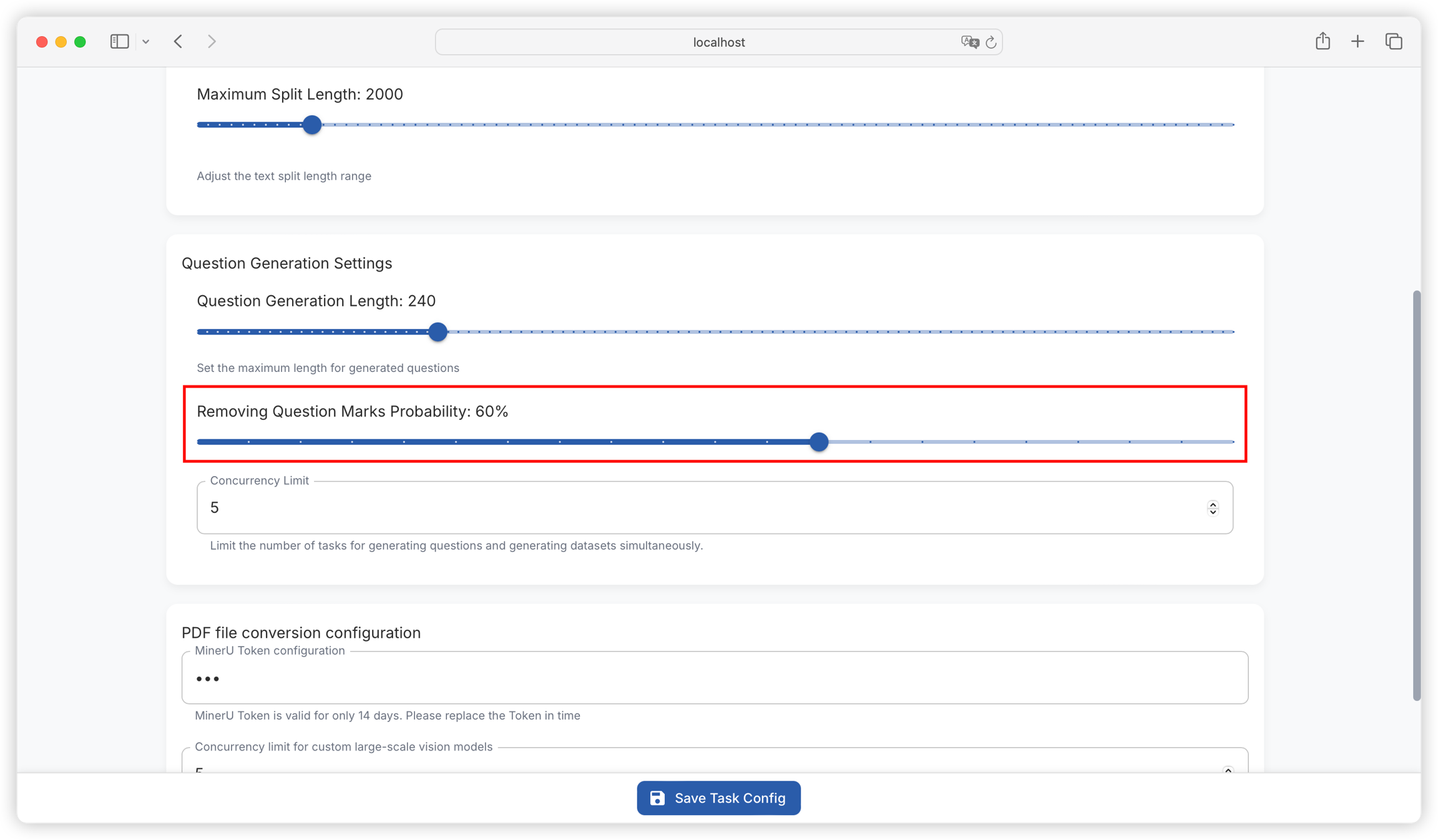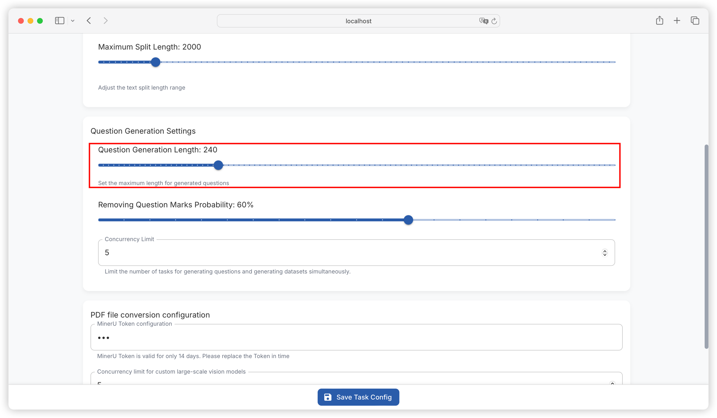 How many questions are generated for each text block is determined by the maximum length for generating questions in "Project Settings - Task Settings". The default setting is to generate one question per 240 characters. For text blocks of around 2000 characters, about 8 questions will be generated. You can flexibly adjust this according to the information density of your literature: