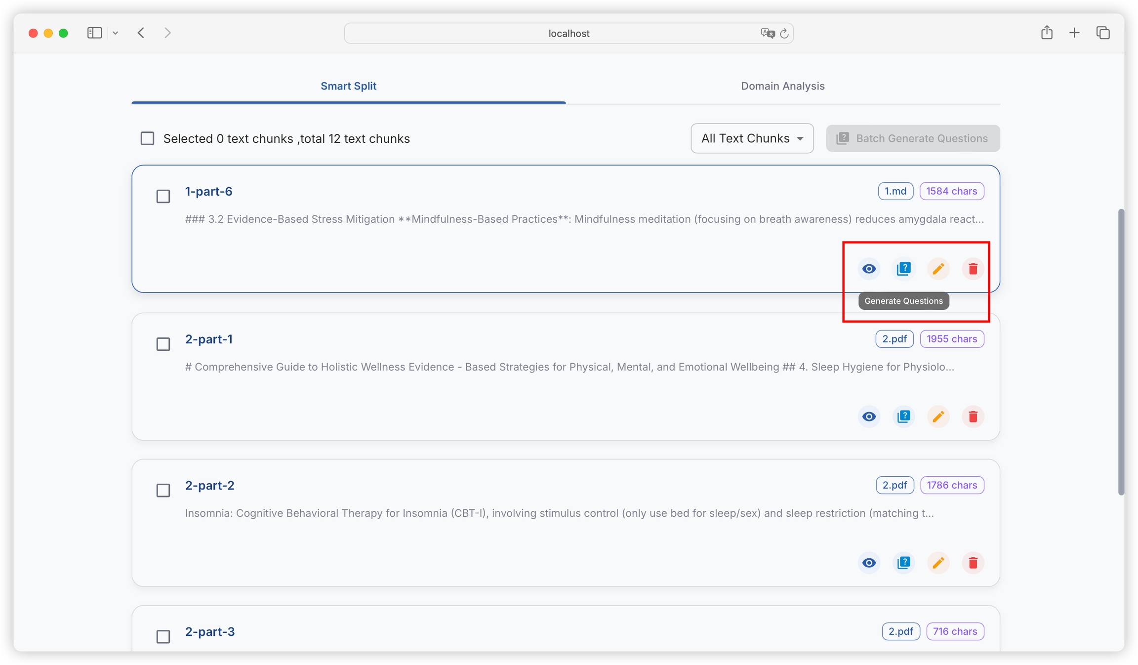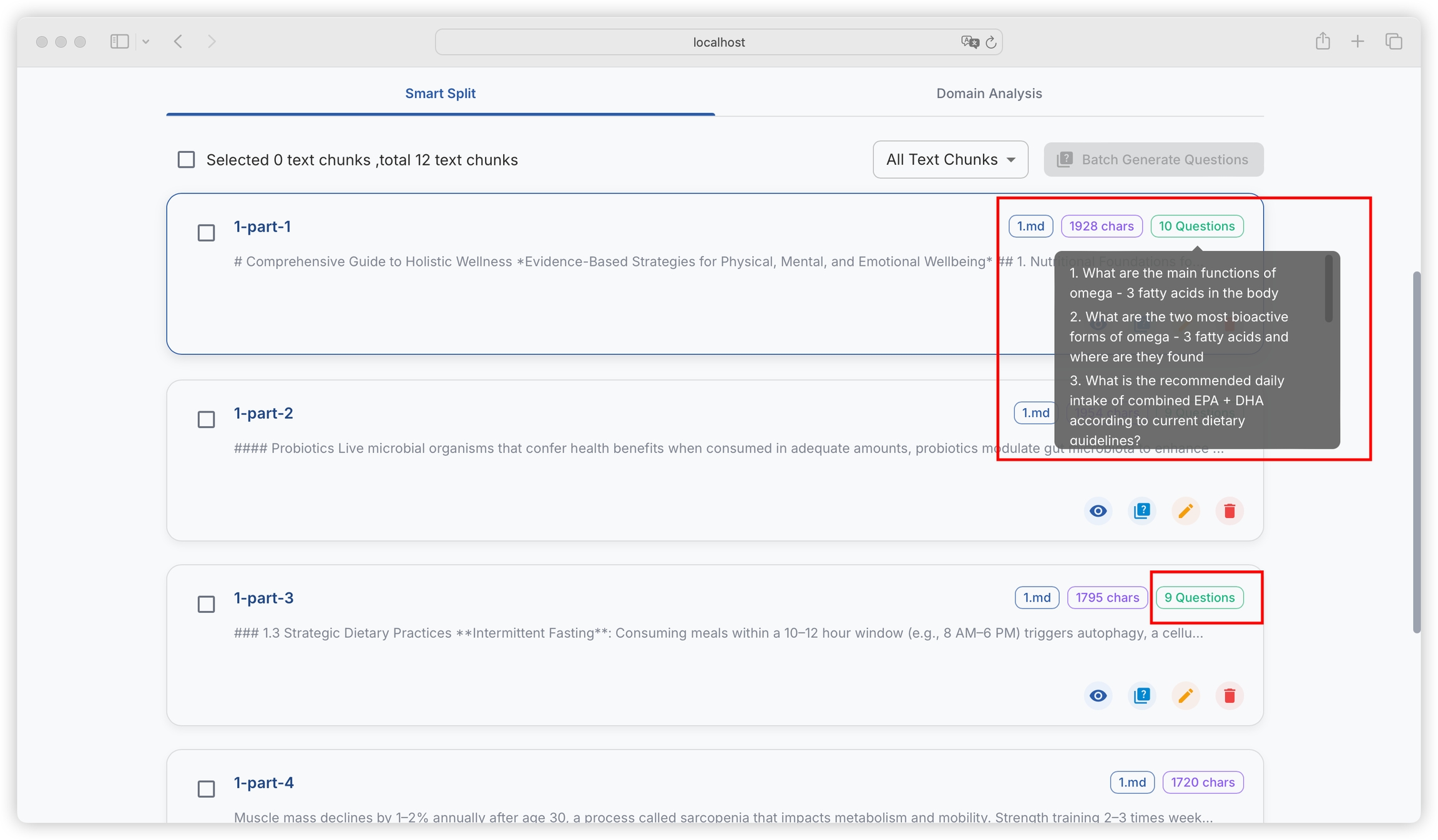 You can filter text blocks with generated questions and text blocks without generated questions: