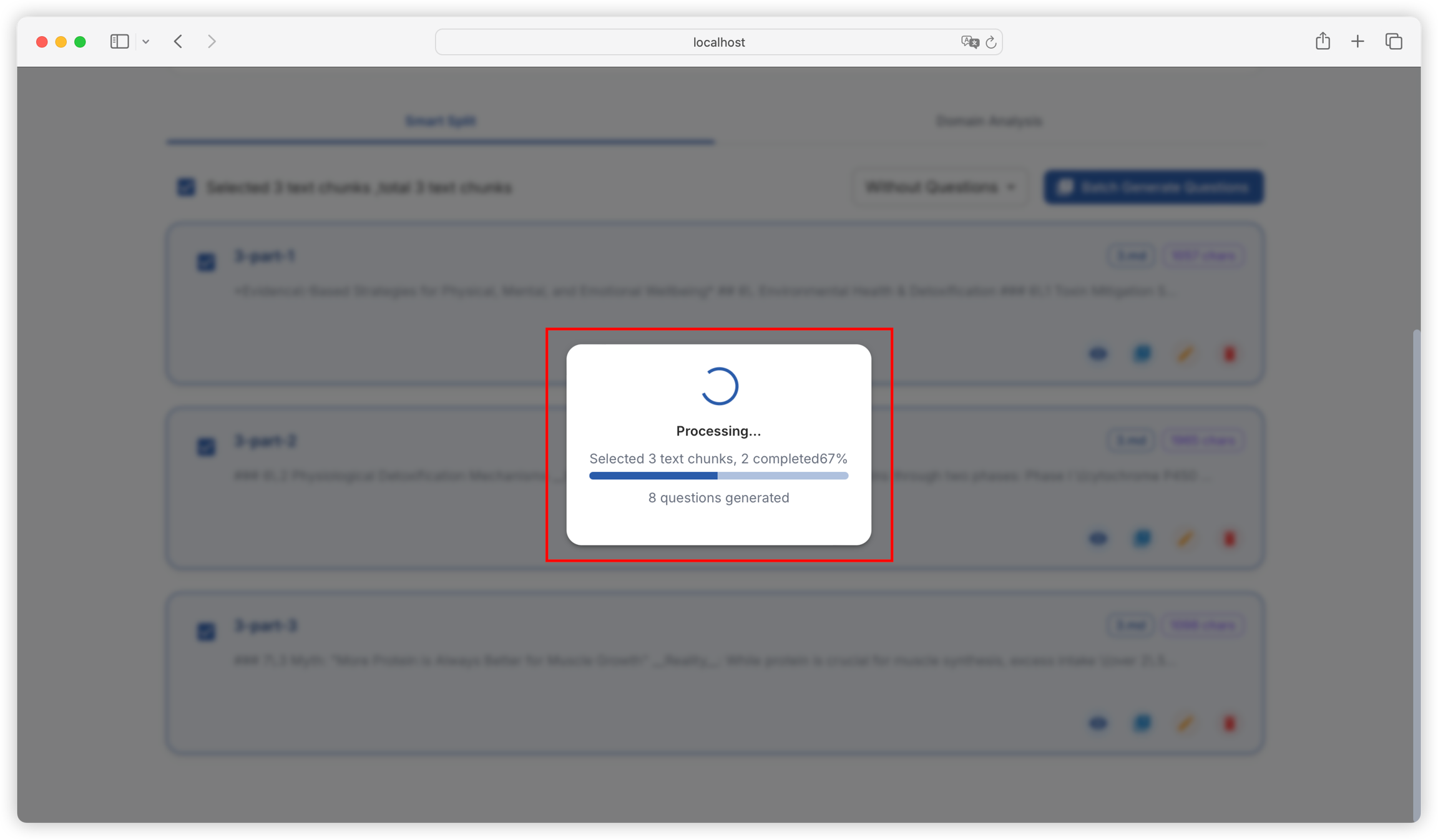 When a batch task is in progress, closing or refreshing the current page will interrupt the task. You can open a new page to check the already generated questions in question management.
