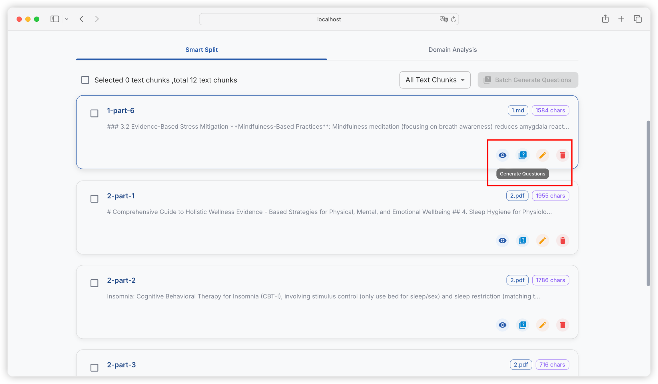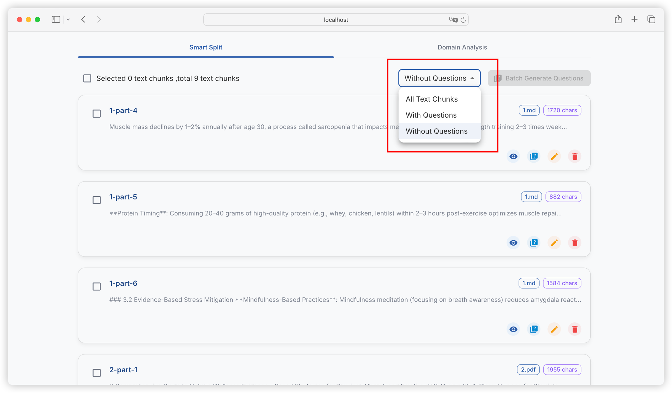 Extract questions from the split text blocks and establish domain tags for the questions.
