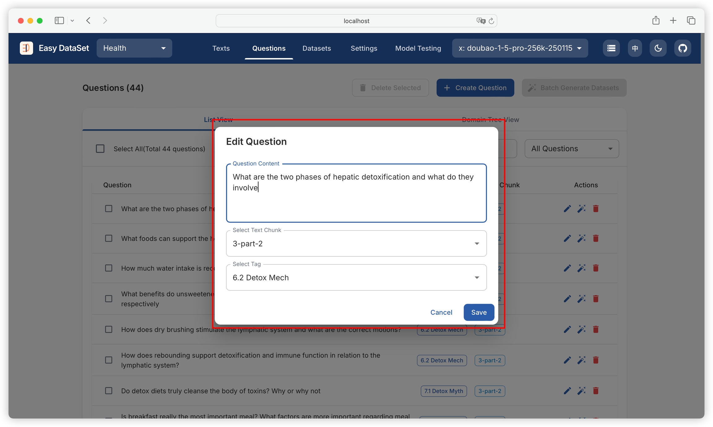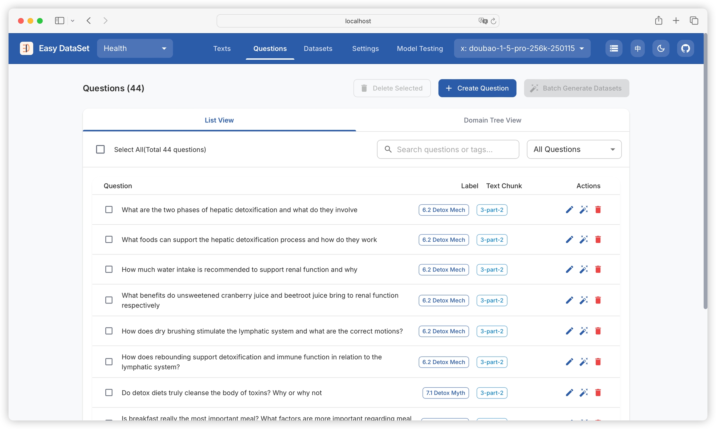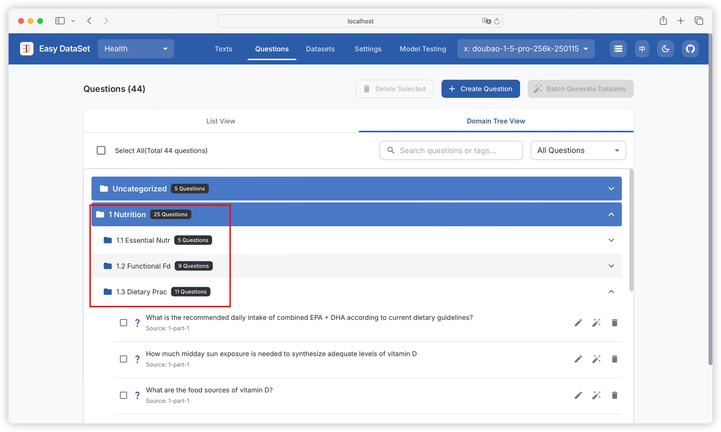 You can view question names, domain tags associated with questions, and text blocks to which questions belong. You can filter by question and tag names: