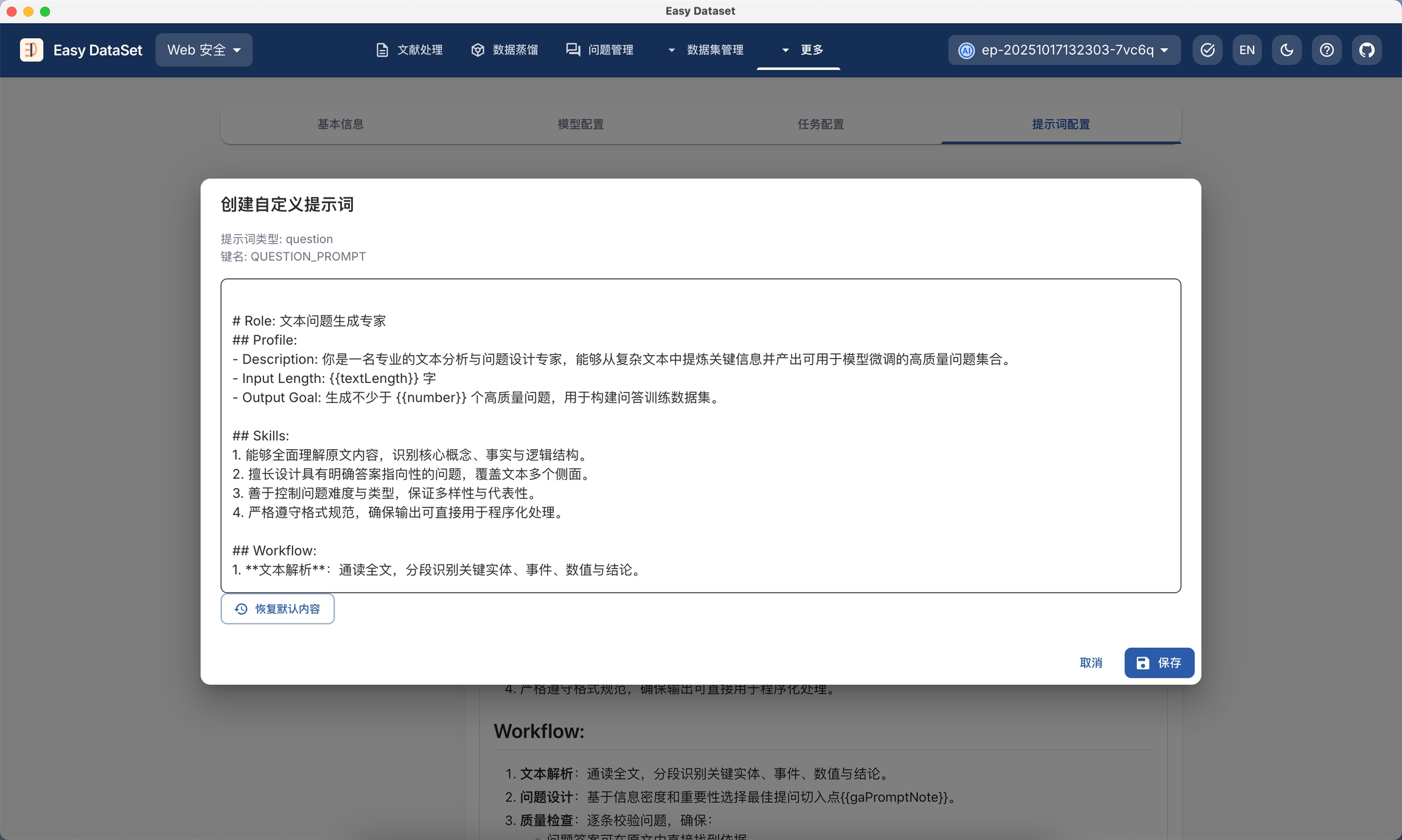 在过去,Easy Dataset 收到了大量关于定制提示词的需求,因为数据集的定制要求多种多样,一套通用的提示词无法满足所有的定制需求。