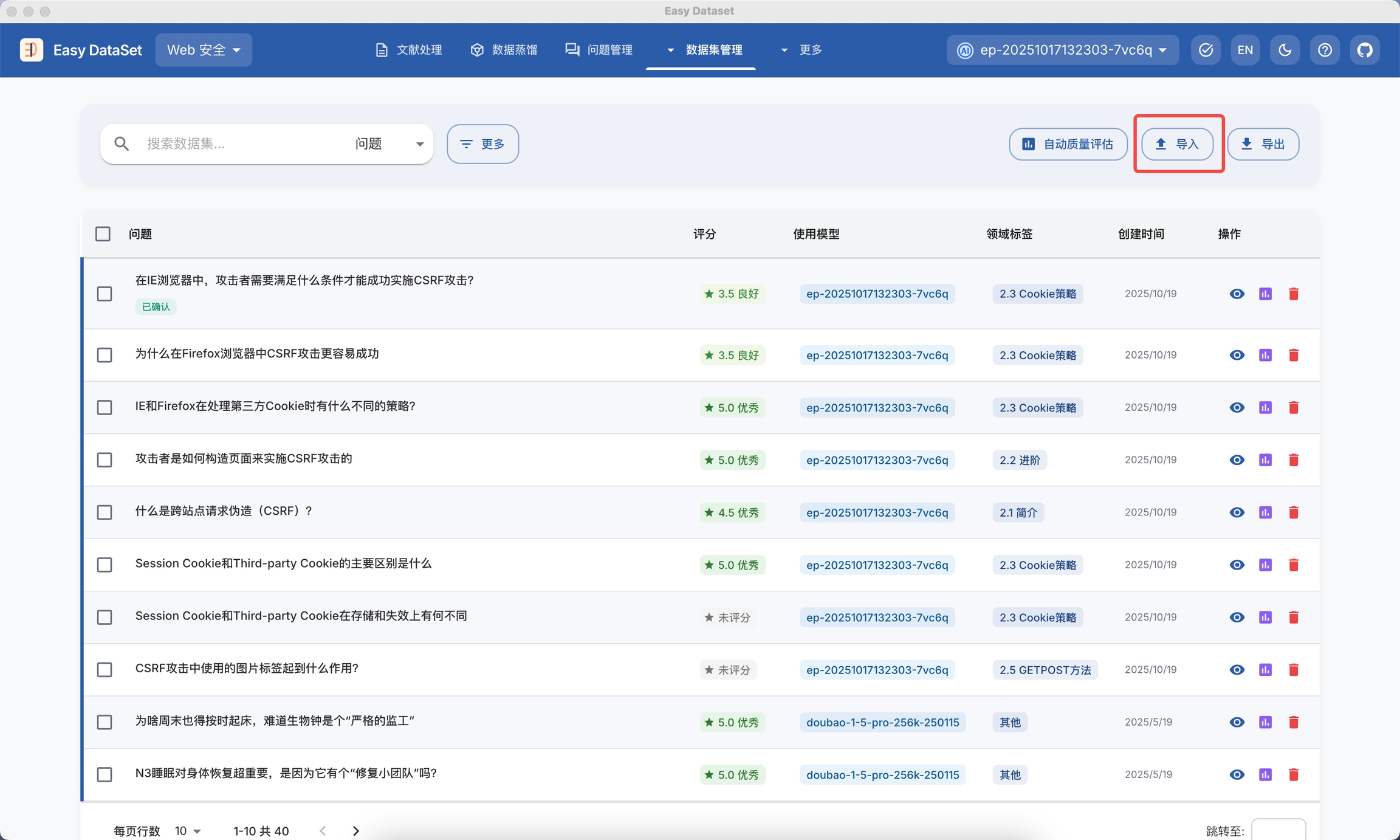 支持直接导入已有数据集,对数据集进行二次标注、评估,或和现有数据集一起使用,在数据集管理模块可点击导入:
