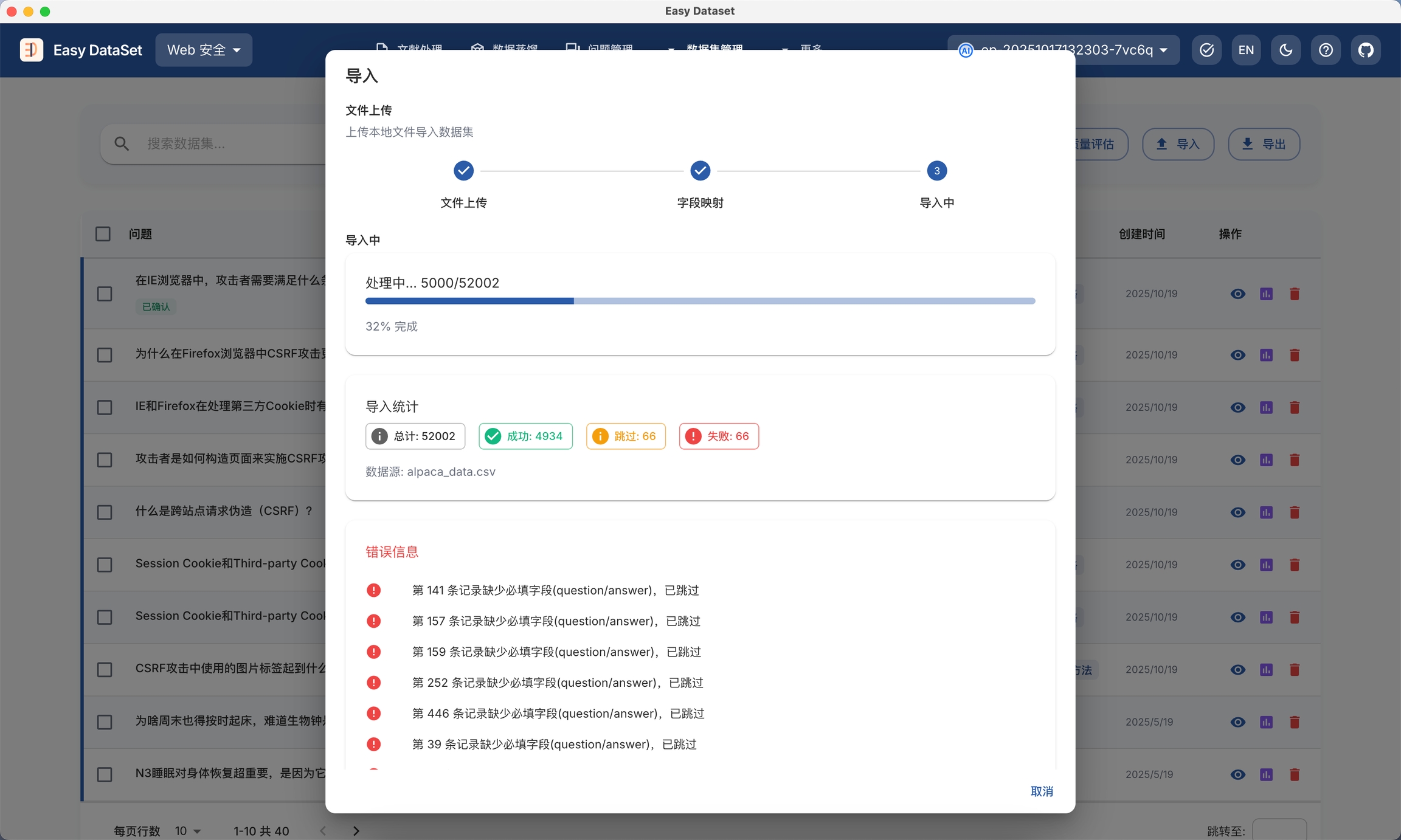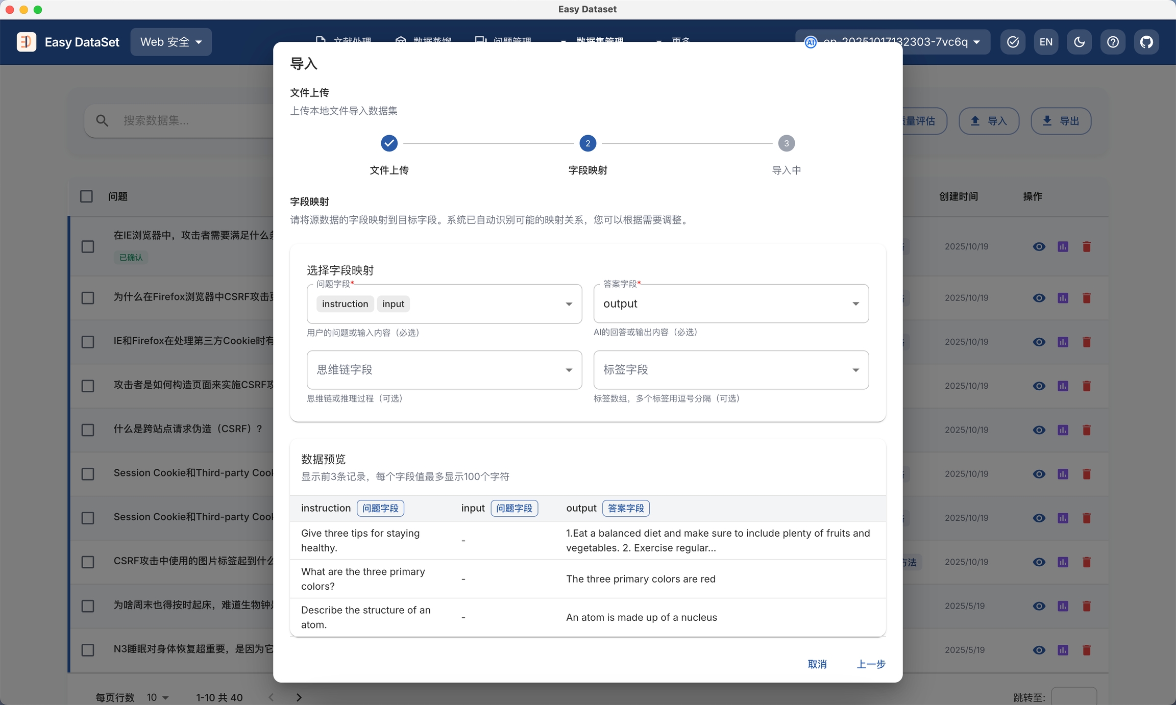 支持自动解析 JSON、JSONL、CSV 三种文件格式,以及多种数据集格式,系统将自动匹配数据集的字段: