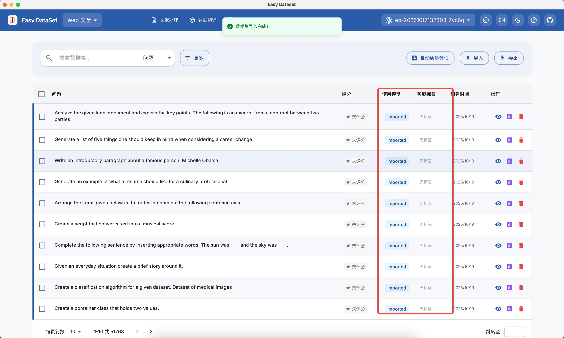 导入后,数据集使用模型列将展示为 Imported,默认关联的领域标签为空: