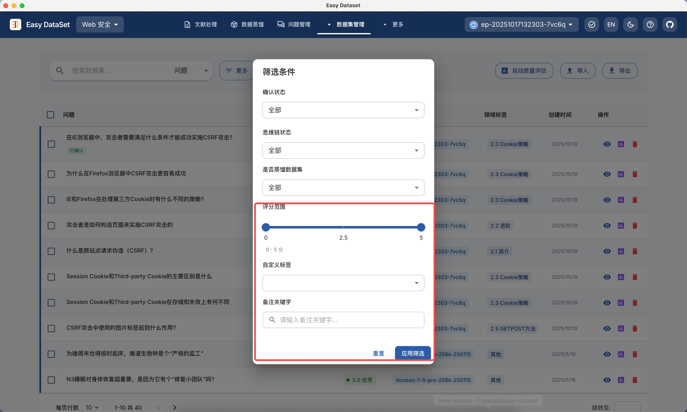 你可以使用 AI 对已有数据集进行质量评估,可对单条数据集发起评估,以及后台批量评估: