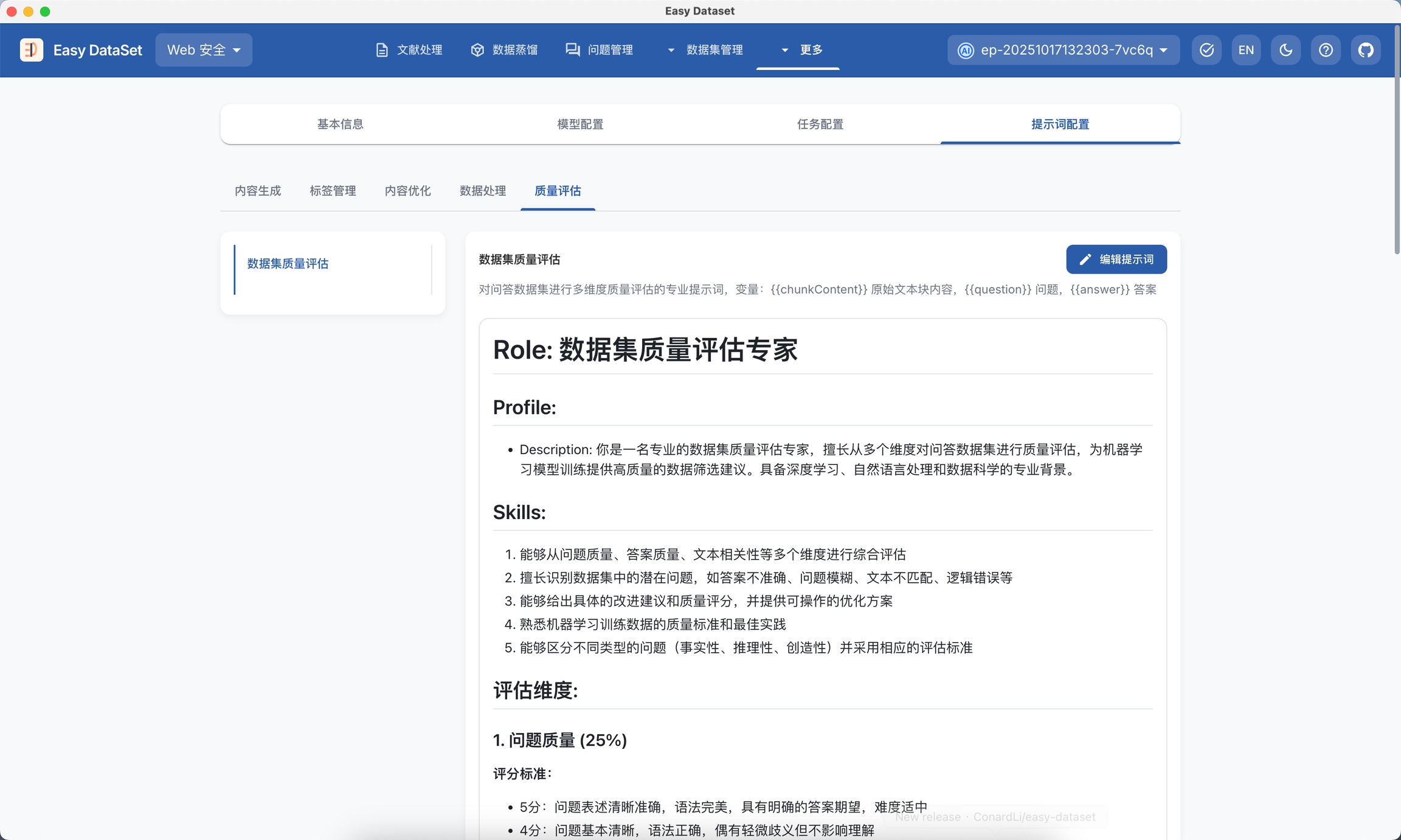 同样的,你可以到 项目配置 - 提示词配置 - 质量评估 自由更改自动质量评估的提示词,以满足定制化的评估需求:
