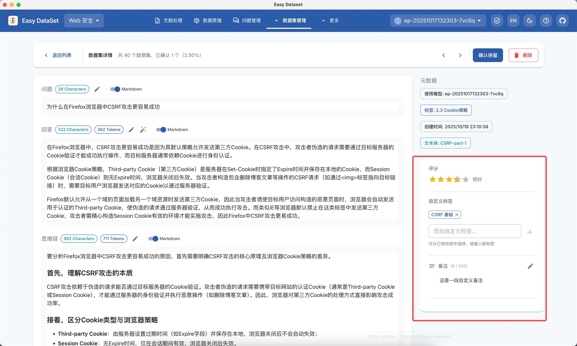点击单条数据集,可查看数据集详情,包含问题、答案、思维链、使用模型、领域标签、创建时间、文本块: